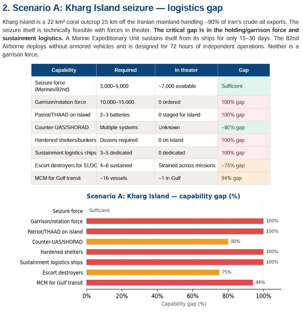 - 情景A(哈尔格岛夺取与坚守): 初始夺取可行,但坚守和驻防面临严重缺口,包括100%的驻防部队、防空系统(爱国者/萨德)、加固掩体和专用补给舰艇。补给线极易受伊朗无人机、弹道导弹和火炮攻击。
