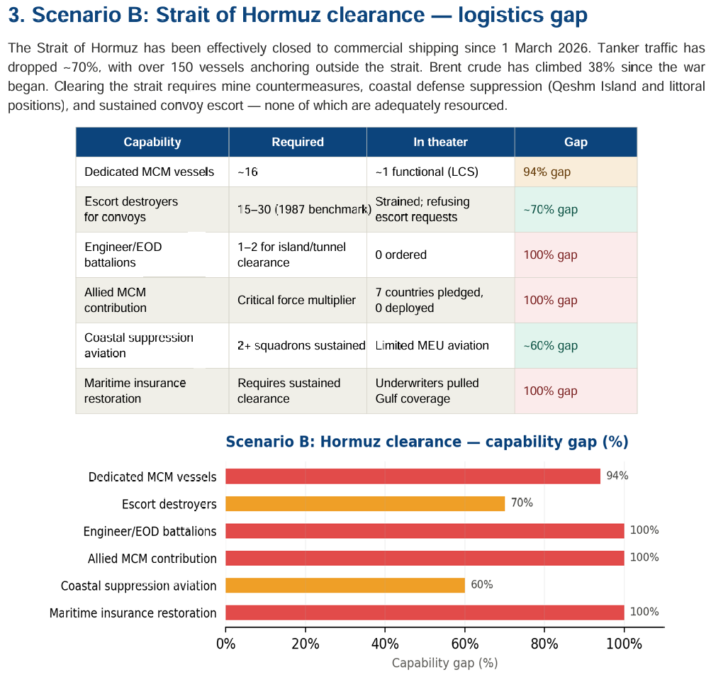 - 情景B(赫尔木兹海峡清理): 除MCM舰艇的94%缺口外,护航驱逐舰(70%缺口)、工兵/爆炸物处理营(100%缺口)以及海岸压制航空力量(60%缺口)均严重不足。