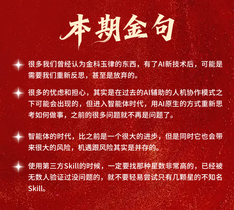 23:21 使用第三方Skill仅选择星数高、经过大量用户验证的安全Skill,机遇和风险并存,要保持风险意识。