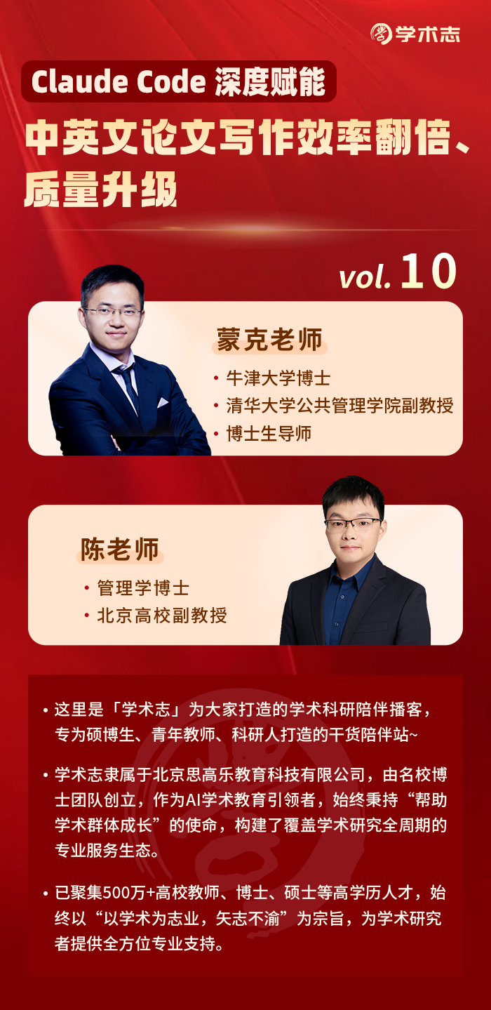 这里是#学术志官方播客#第十期,本期内容蒙克老师带你深度使用Claude Code,真正实现中英文论文写作效率翻倍、质量升级,AI不是替代写作,而是帮你把时间还给研究。