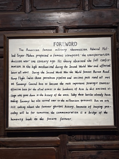 二战中印缅战区交通史纪念馆位于祥云县云南驿镇云南驿古道中段。抗战时期,这里曾是飞虎队(中国空军美国志愿援华航空队)和盟军指挥部,后长期作为云南驿村公所使用。驼峰空运期间,云南驿机场平均每2-3分钟就有一架飞机起降,日均起降超过100架次。高峰时期,这里战机上百架,各类人员超过3000人,是“飞虎队”的重要战斗基地。