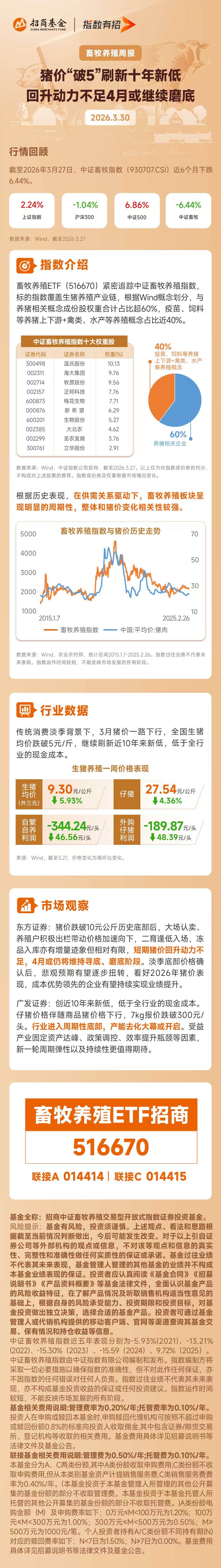00:47从指数构成来看,畜牧养殖ETF(516670)紧密追踪该指数,全面覆盖生猪养殖产业链。其中,与养猪直接相关的企业权重占比超过60%,前十大权重股包括温氏股份(10.13%)、海大集团(9.76%)、牧原股份(9.56%)等龙头企业,集中度较高,是观察行业核心资产表现的“晴雨表”。历史数据表明,在供需关系的强驱动下,畜牧养殖板块呈现明显的周期性,指数走势与猪价变化的相关性极强。