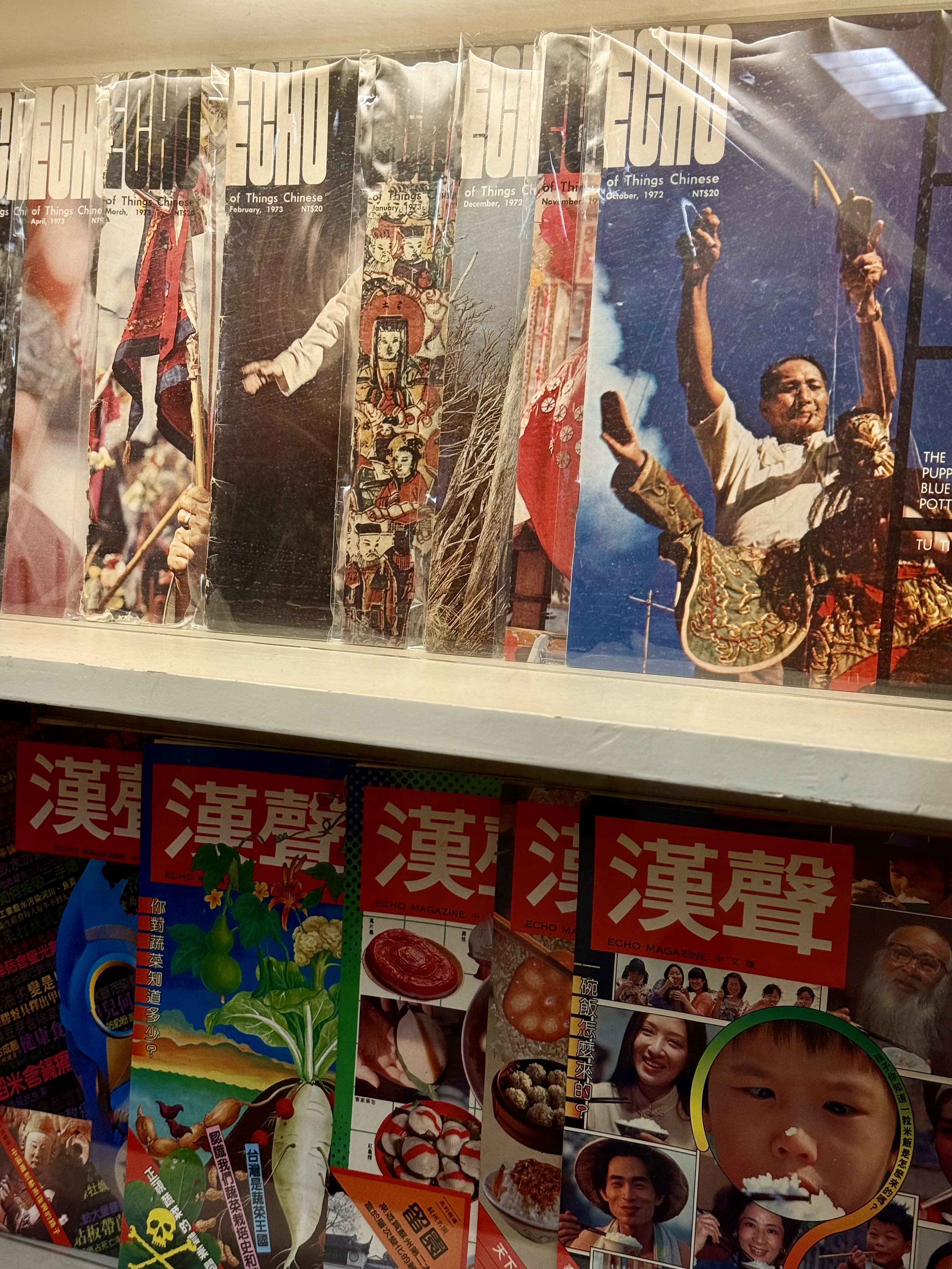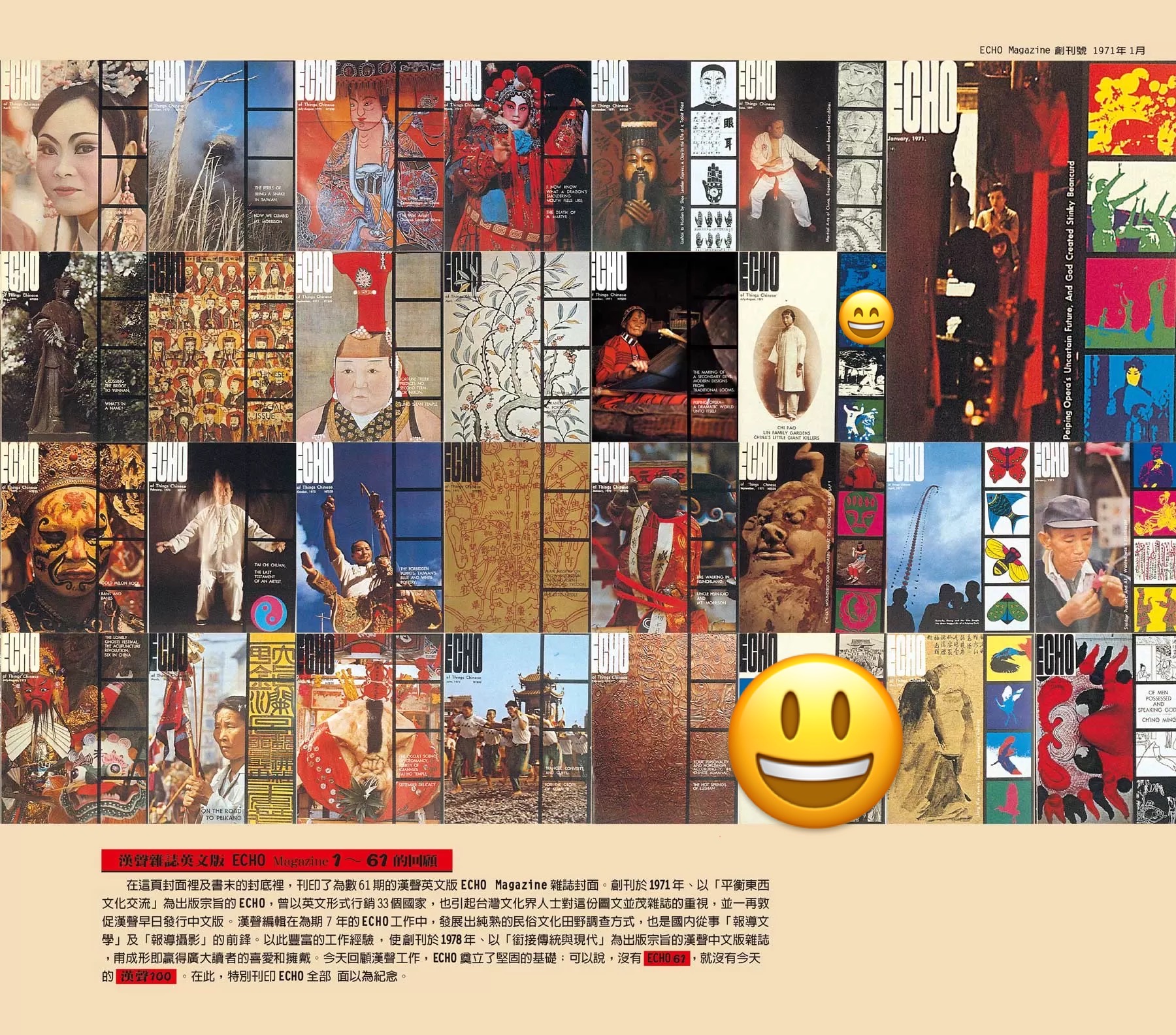 ⬇️ 1970 年代出版的汉声英文版《ECHO》杂志封面集锦。汉声曾以英文形式行销33个国家,也是台湾本土「报导文学」及「报导摄影」的前锋。1970年代台湾经济起飞,来台外商增加,透过《ECHO》报导传递,《ECHO》成为台湾文化的国际展示橱窗;同时间中国大陆在Wen Ge的封闭下,台湾的国际发声也导了当年大中华文化的话语权。(文‧陈亭聿 / 图‧汉声出版社)