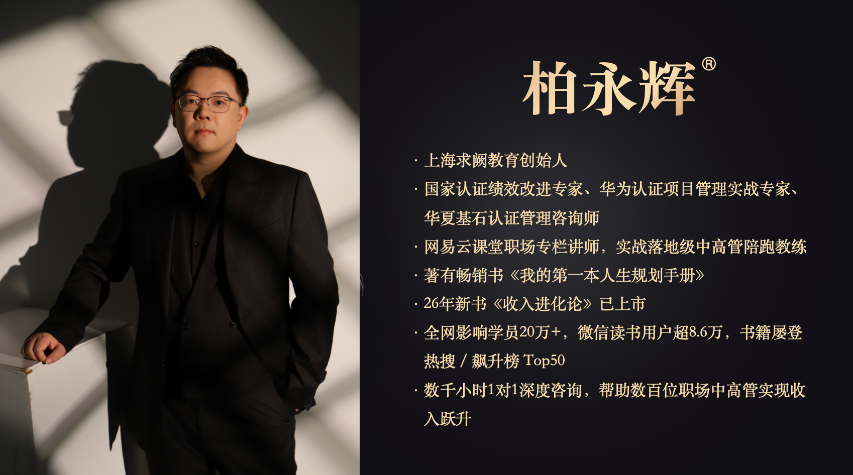 著有畅销书《我的第一本人生规划手册》,2026年新书《收入进化论》热销中。全网影响学员20万+,微信读书用户超8.8万,书籍屡登热搜 / 飙升榜 Top50,数千小时1对1深度咨询,帮助数百位职场中高管实现收入跃升。