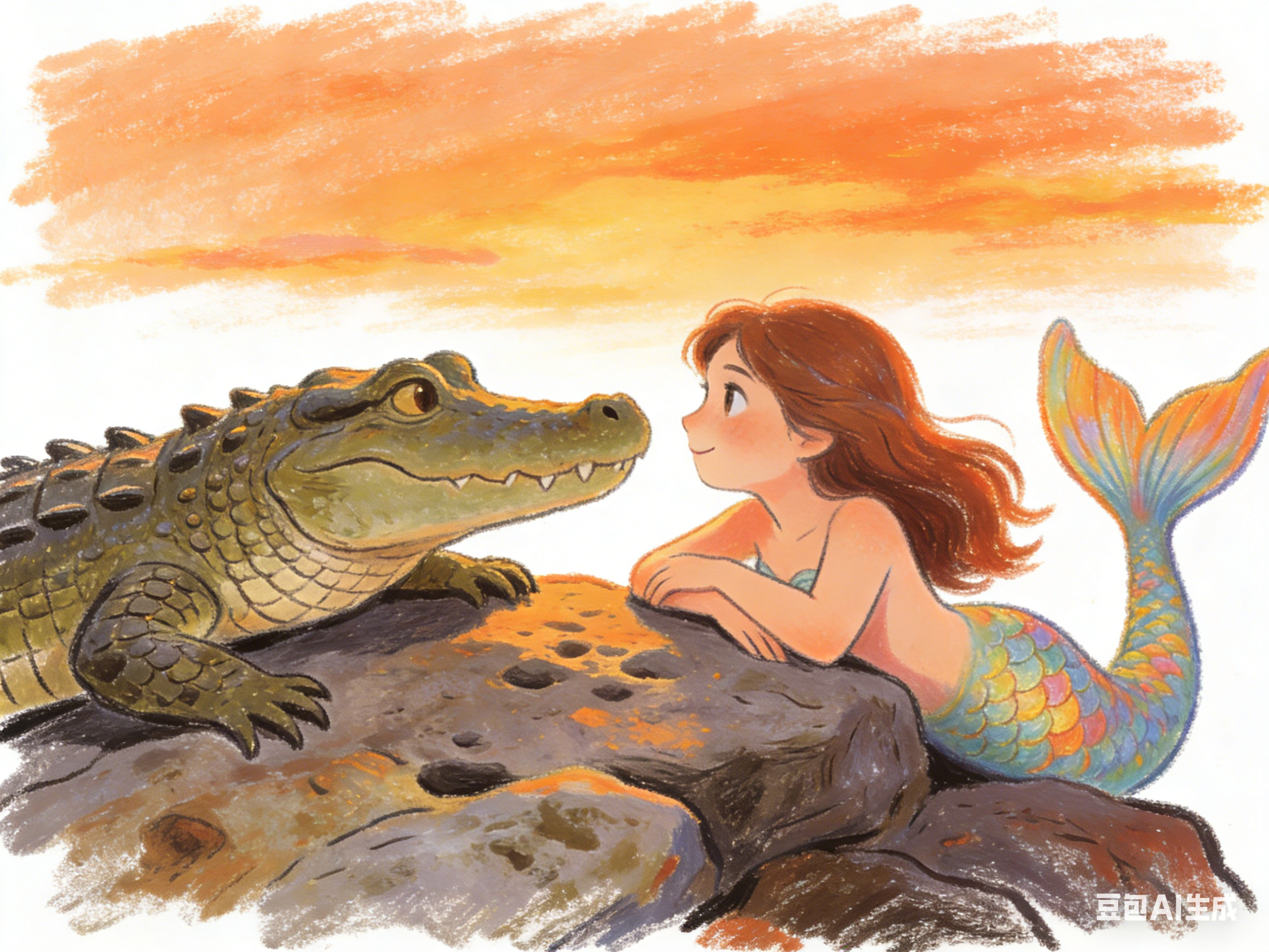 鳄鱼不知道她在想什么。他只是趴在那里,看着她在光里的侧脸,头发垂在水面上,尾巴轻轻晃着,鳞片一闪一闪的。他觉得她真好看。但他没说。