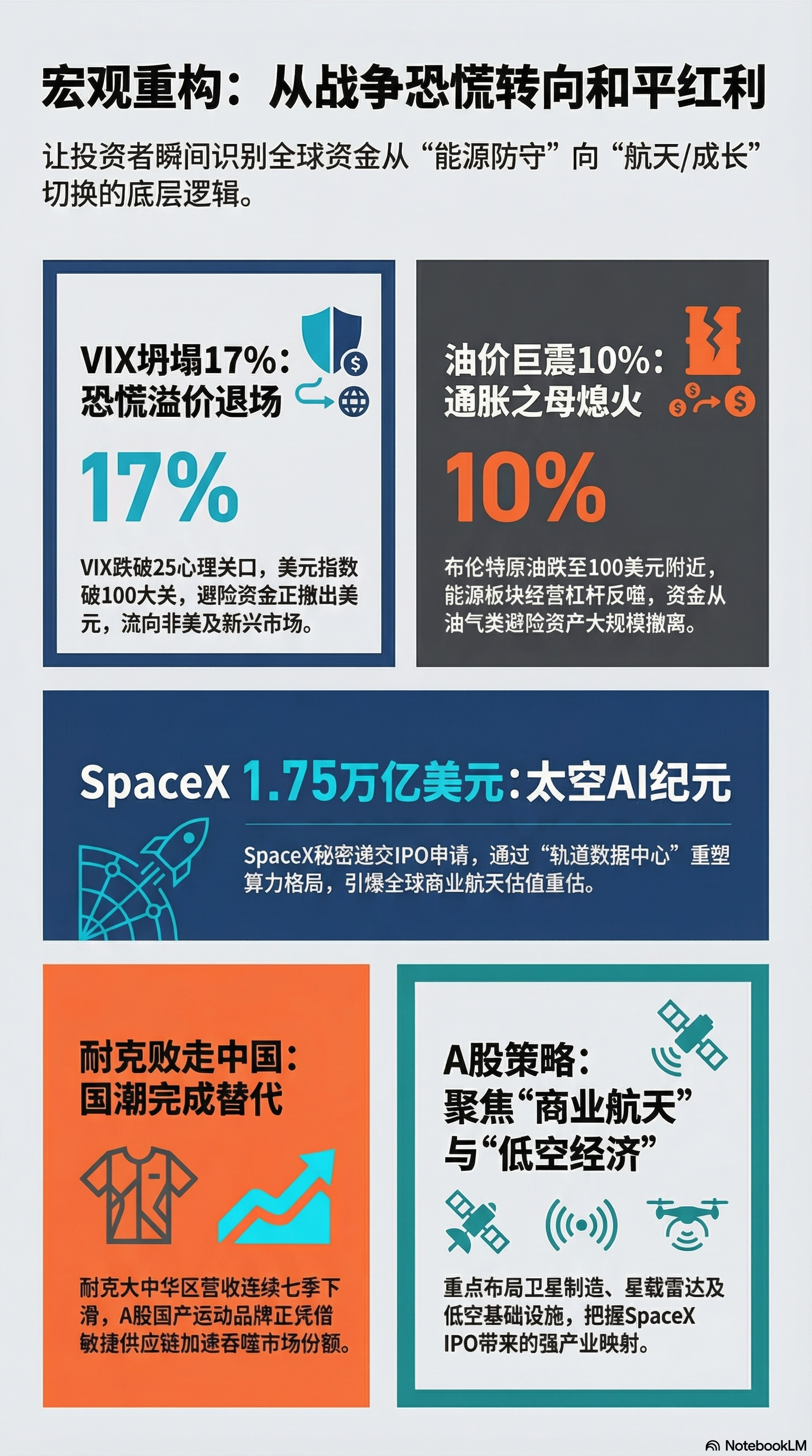 这份报告详尽分析了2026年4月1日全球资本市场的剧烈波动及其对中国A股的启示。文章指出,随着中东局势显现缓和迹象,市场逻辑从“战争恐慌”转向“和平红利”,导致原油价格大幅暴跌和美股风险偏好的全面修复。核心亮点包括SpaceX秘密启动巨额估值IPO引发的商业航天估值重构,以及耐克因中国市场疲软和关税压力导致的财务业绩“爆雷”。针对A股投资者,作者建议利用美元走弱带来的流动性窗口,积极布局卫星互联网、低空经济及受益于成本下降的国产消费品牌。最后,报告提醒应果断规避失去溢价支撑的传统能源板块,把握从红利低波向高弹性成长赛道的风格切换。
