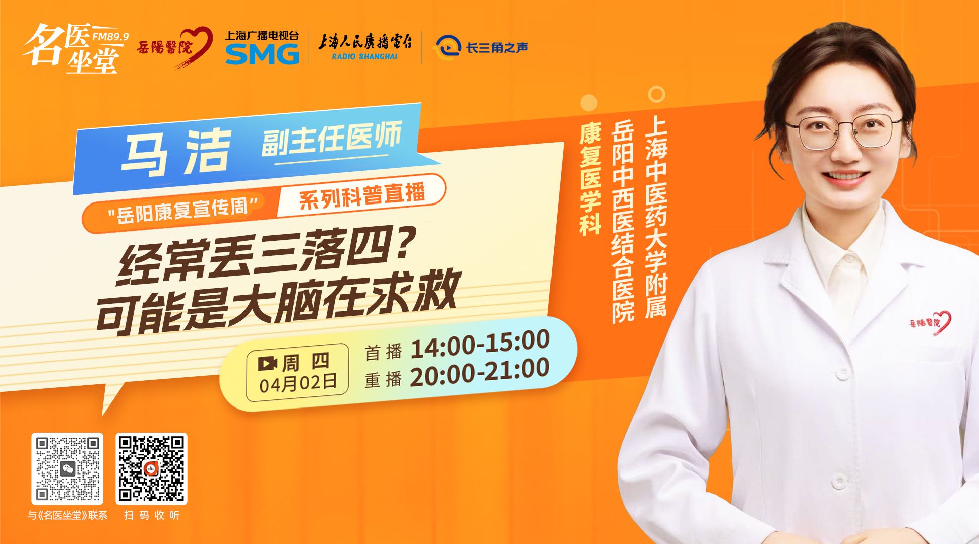 “岳阳康复宣传周”系列科普直播第四期,为您邀请到上海中医药大学附属岳阳中西医结合医院康复医学科 马洁 副主任医师,和您聊聊“经常丢三落四?可能是大脑在求救”。