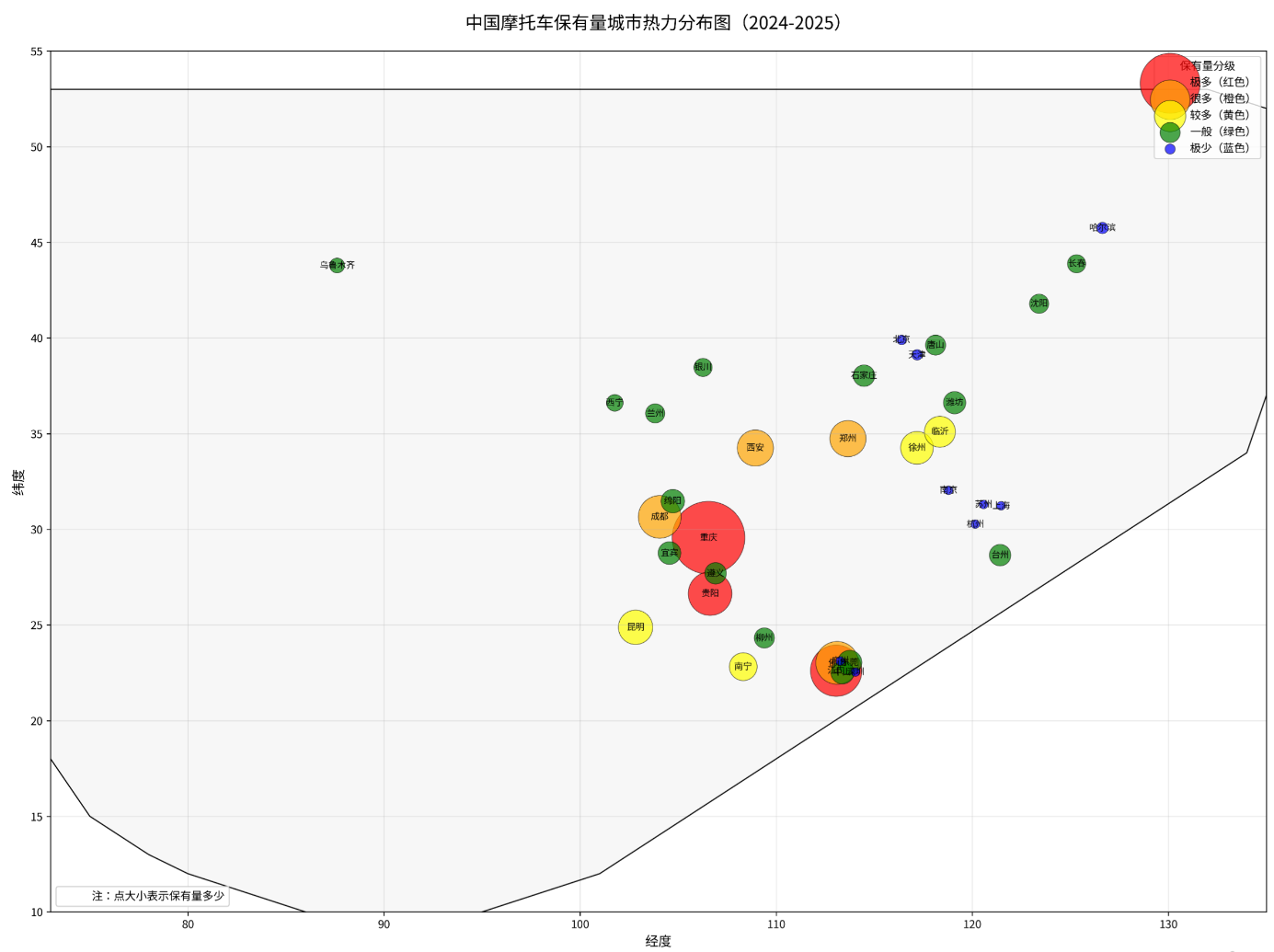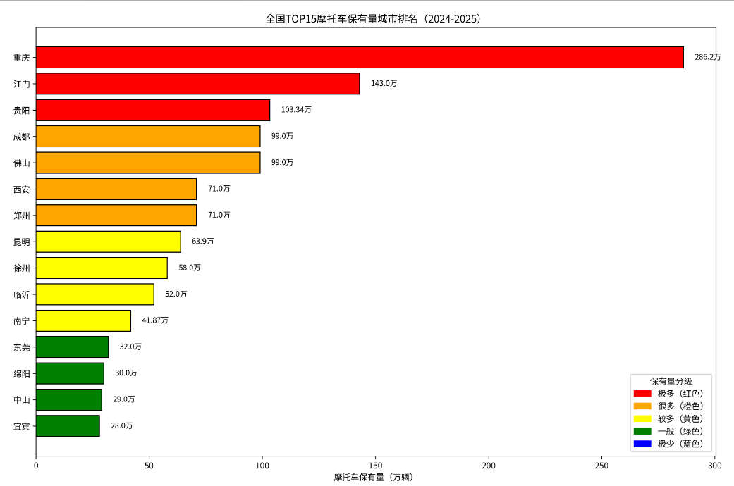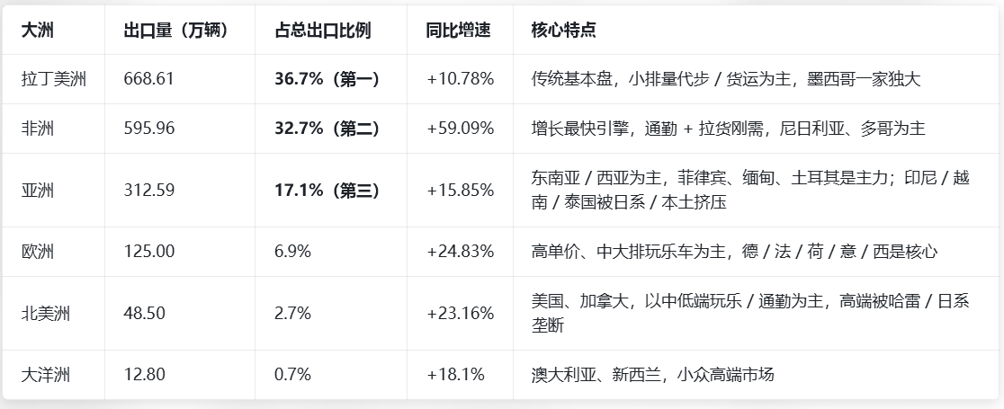 我认为,张雪个人的成功,离不开他自身的坚韧与梦想;但张雪机车的成功,一定离不开重庆这片成熟的机车制造土壤,更离不开整个中国摩托车产业的支撑。2019-2025 年中国摩托车总销量、国内销量、出口销量、营业收入等核心数据总表(单位:万辆;%)分大洲出口:总量 & 占比(2025 全年)中国摩托车保有量热力地图: