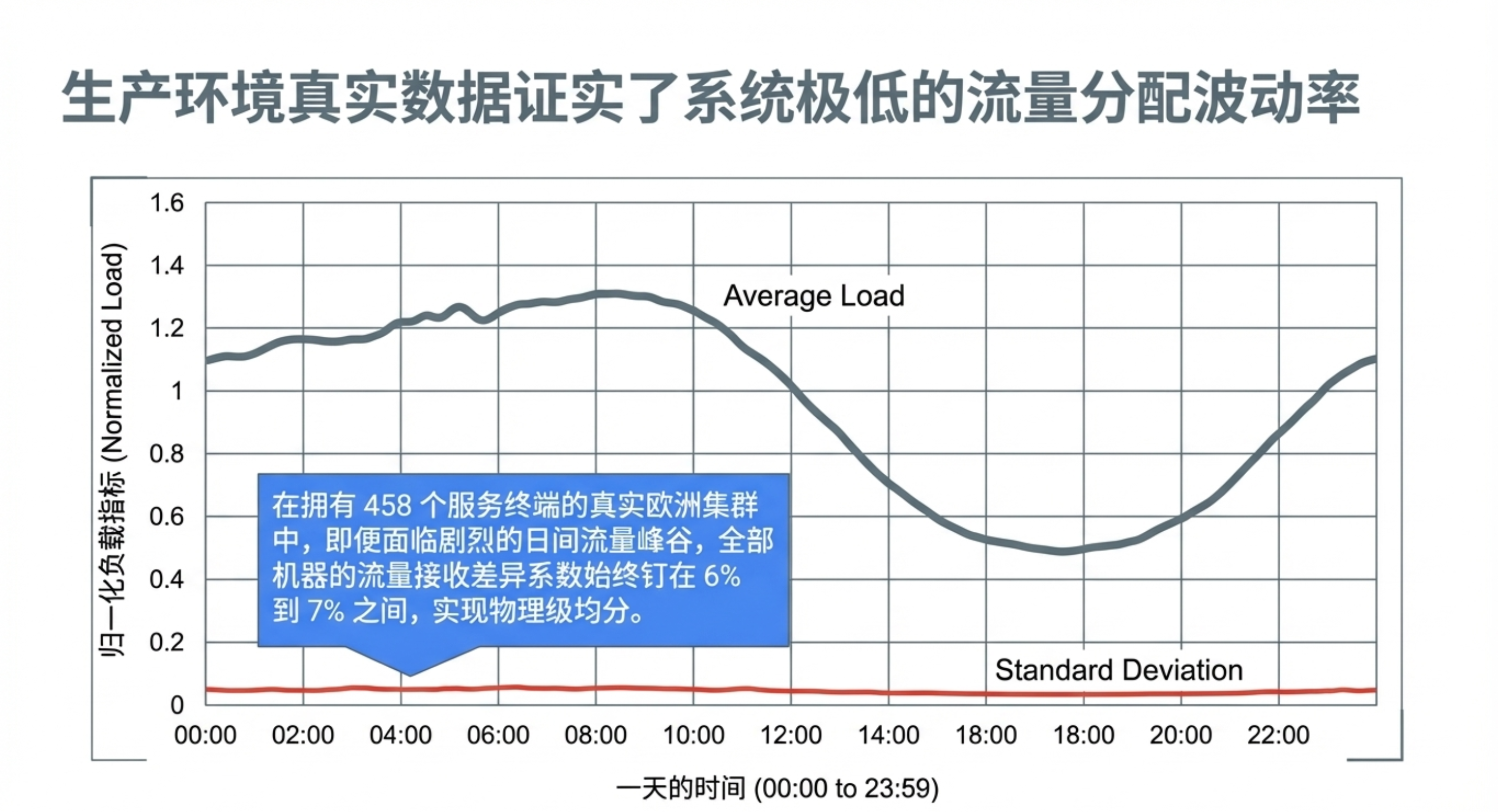 - 均衡效果:在生产集群中,各后端负载的变异系数(CV)通常仅为6%-7%,均衡性极佳。