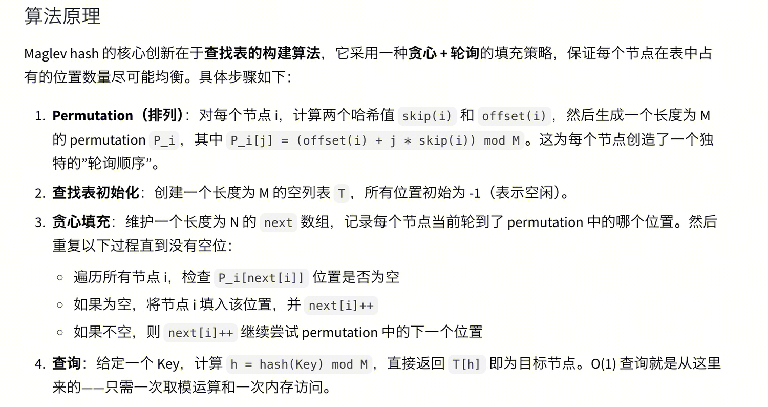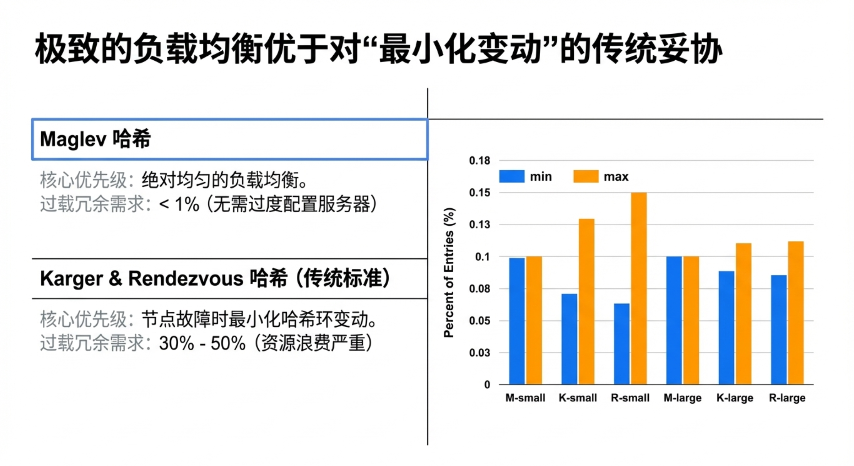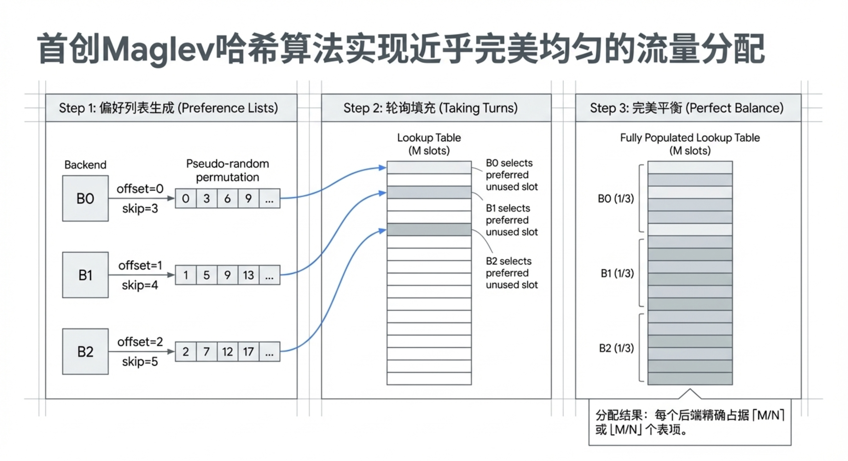 - Maglev 一致性哈希:这是论文的核心贡献。与传统一致性哈希(如 Karger 哈希)不同,Maglev 哈希优先保证负载的极致均匀性。通过为每个后端生成偏好表并轮询填充,最终每个后端分配的哈希槽位差异小于1%,极大避免了热点。