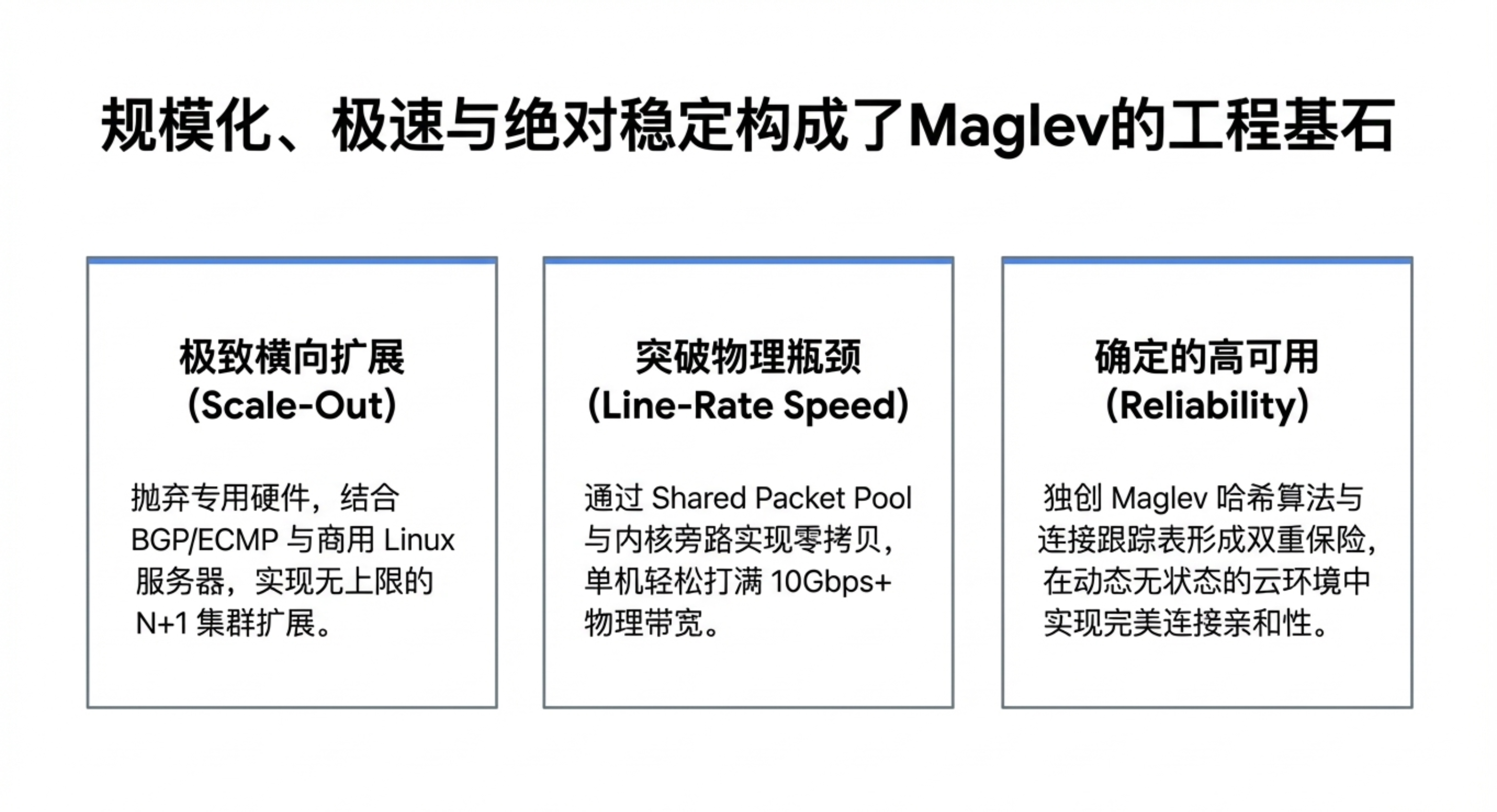 Maglev 证明了:用软件和商用硬件,完全可以构建出超越专用硬件的负载均衡系统。其设计思想——内核旁路、自定义一致性哈希、连接跟踪与 ECMP 的结合——已被广泛应用于现代云基础设施(如 AWS 的 NLB、Google 的 Andromeda 等)。对于任何构建大规模网络服务的人来说,Maglev 都是一份必读的“基础设施设计教科书”