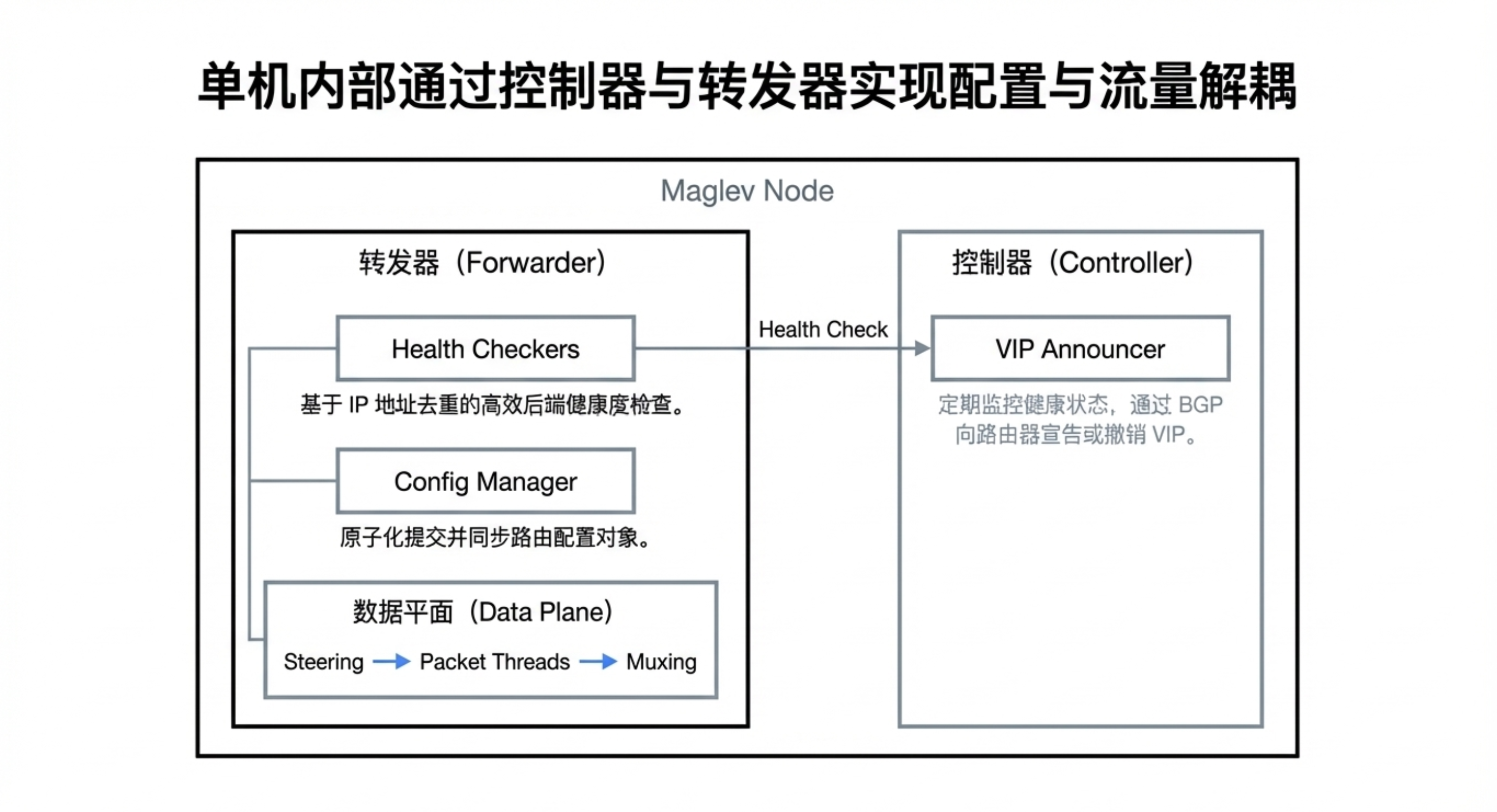 - 控制器:定期检查转发器健康状况,通过 BGP 协议向路由器宣告或撤回虚拟 IP(VIP),控制流量入口。