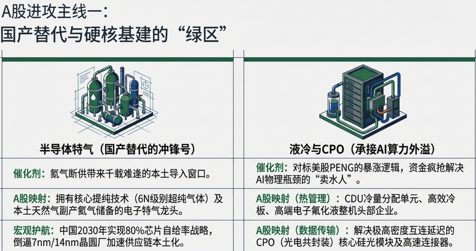 战术聚焦(硬核基建): 聚焦国产替代(特别是7nm/14nm国内自给目标的达成)及AI物理基建(液冷、CPO、卫星互联网)。