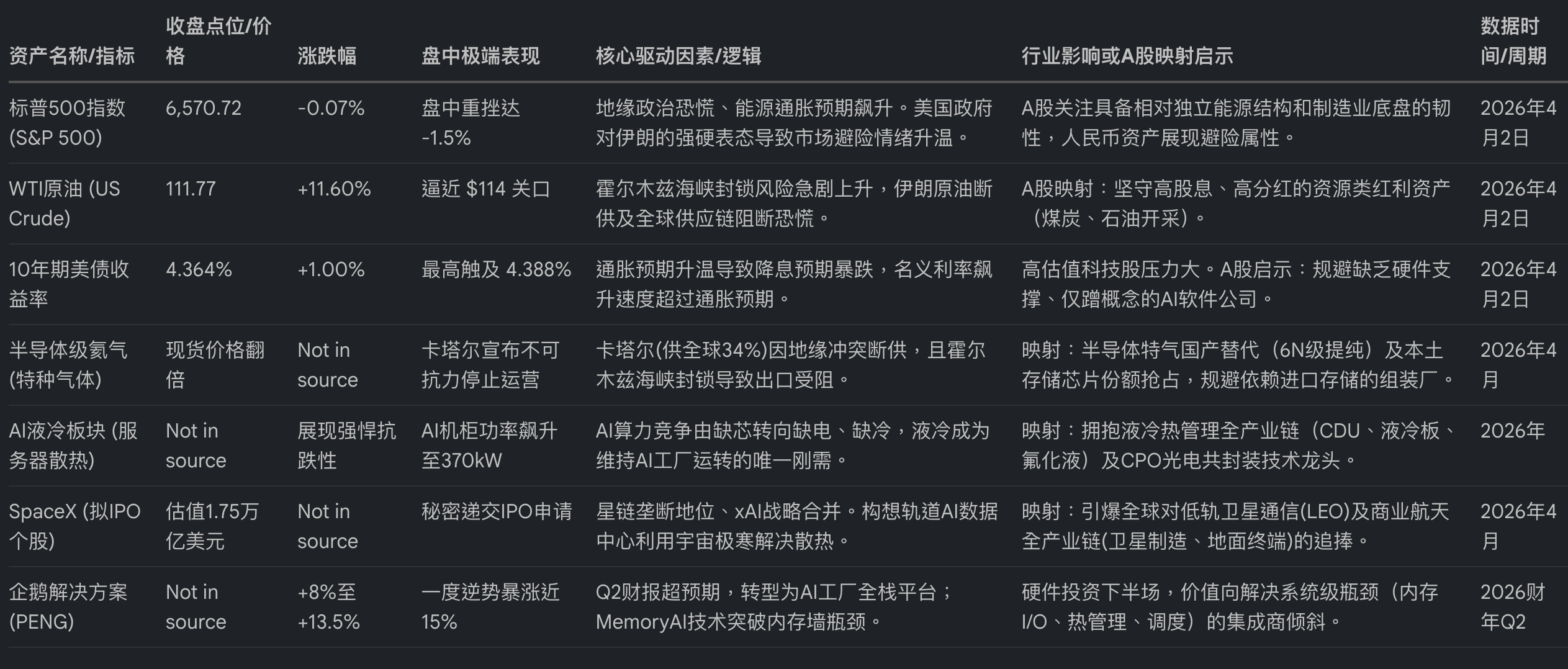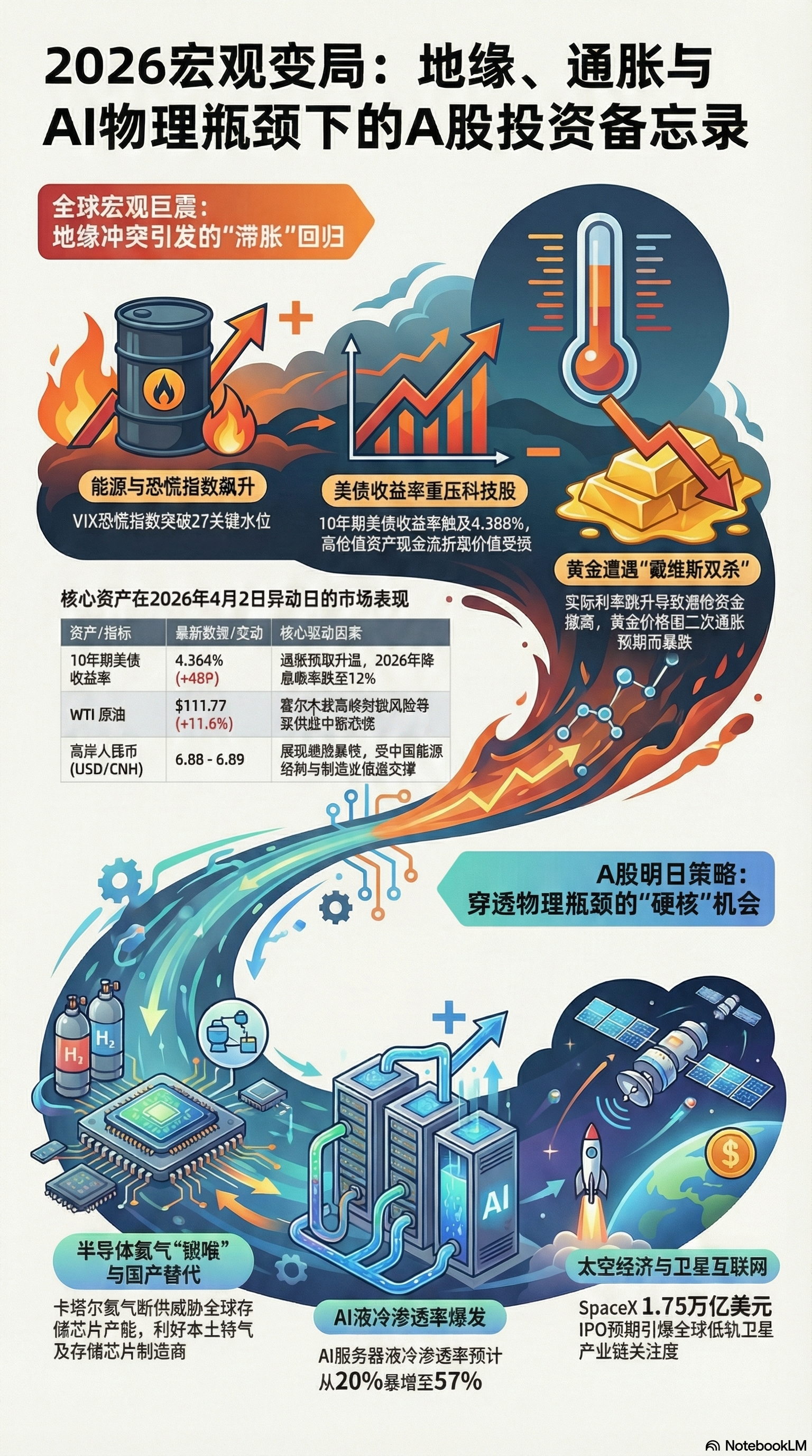 这份材料深入分析了2026年4月2日全球宏观经济与资本市场的剧烈波动,重点探讨了地缘政治冲突对美股及A股的深远影响。文中指出,随着美国对伊朗态度的转硬,原油价格暴涨引发了严重的滞胀担忧,导致美债收益率上升并压制了科技股表现。由于霍尔木兹海峡面临封锁,全球半导体行业陷入了氦气断供危机,这对存储芯片供应链构成了物理性威胁。与此同时,AI基础设施领域正从算力竞争转向液冷散热技术的突破,而SpaceX潜在的高估值IPO也为航天产业注入了新活力。针对即将到来的清明假期,作者建议投资者关注国产特种气体替代、高股息资源股及自主可控的军工板块,以应对外部环境的不确定性。