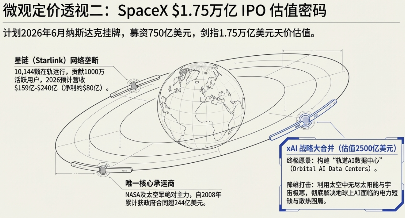 马斯克的终极散热叙事SpaceX近期提交的IPO申请及1.75万亿美元的估值,不仅基于其星链(Starlink)的垄断地位,更是其合并xAI后提出的颠覆性构想:轨道AI数据中心。这是对真相三中“物理瓶颈”的终极回应。马斯克试图利用宇宙接近绝对零度的极寒环境(无限散热汇)和无尽的太阳能,彻底解决地球上AI算力的能耗与散热困局。这一“离开地球办AI”的宏大叙事,正成为2026年全球科技股最大的资金虹吸器,将商业航天的估值逻辑从传统通信直接升维至全球算力基础设施。