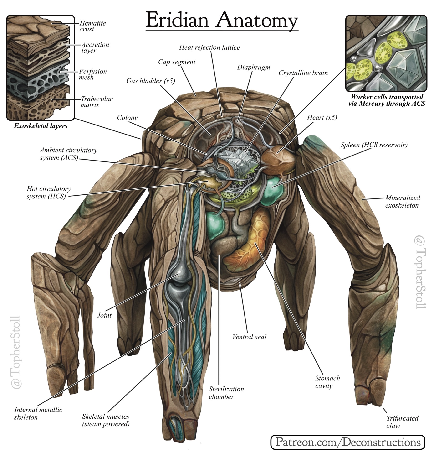 洛基生物学设定彩蛋:洛基作为硅基生命体,其 “石头蜘蛛” 造型融合地质构造与深海生物特征,六足肢体、岩石外壳的设计既符合波江座高重力 / 高温的生存环境,也呼应其种族擅长精密制造的天赋,对应视频中 “洛基的生物学设定详解”。