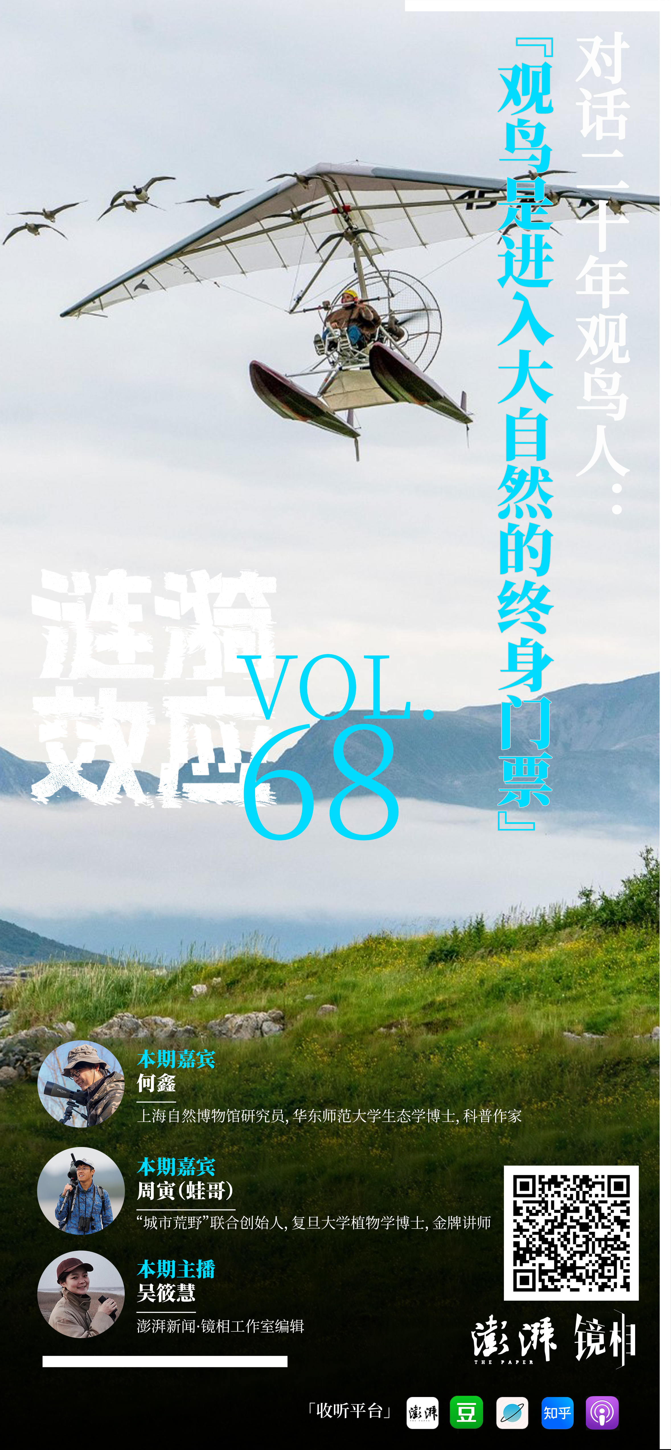 本期《涟漪效应》,我们请来两位资深的观鸟爱好者:一位是上海自然博物馆研究员、华东师范大学生态学博士何鑫老师,他从大学开始观鸟,20年来完成了从观鸟新人到科研工作者、再到科普引路人的身份转变;另一位是复旦大学植物学博士、城市荒野工作室联合创始人周寅老师,大家更熟悉他的外号“蛙哥”。蛙哥从高中时代开始系统观鸟,至今也有20年“鸟龄”,目前在国内观察鸟类超过一千种。