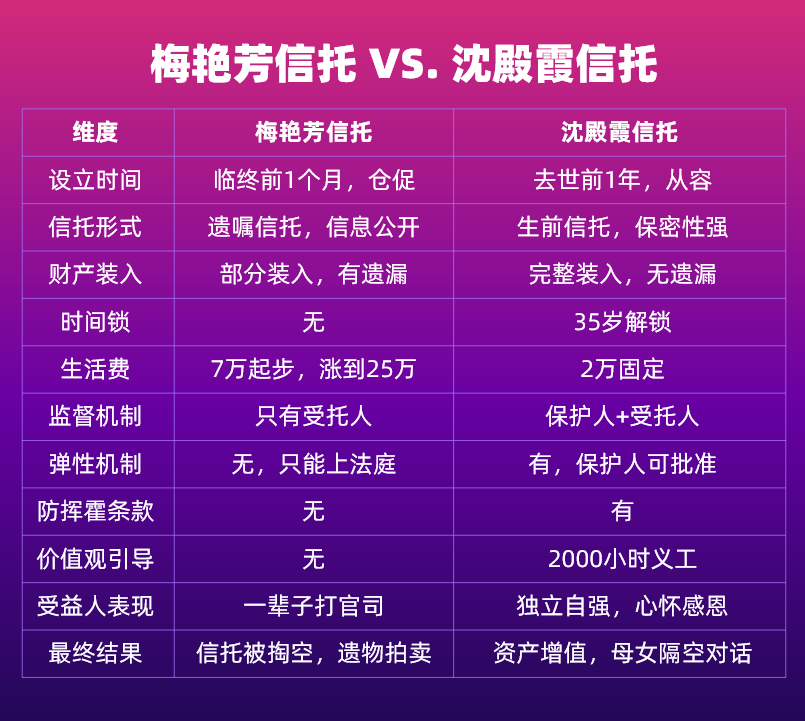 沈殿霞(肥姐)、女儿郑欣宜、郑少秋合影梅艳芳信托 VS. 沈殿霞信托沈殿霞信托设计成功的关键因素: 第一:时间从容,生前设立 第二:财产完整装入,没有尾巴 第三:时间锁设计,对抗人性弱点 第四:保护人机制,建立制衡 第五:生活费“柔性供给”,引导成长 第六:防挥霍条款,隔离风险 第七:2000小时义工服务,塑造价值观* 图片源自网络,如有侵权请联系删除。感谢每一位创作者分享。