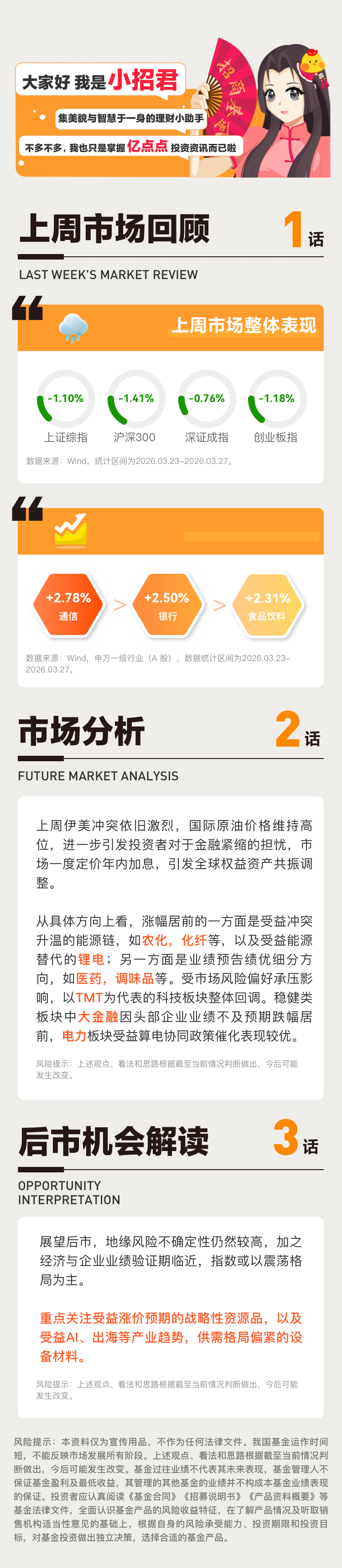 00:22这一周指数走势呈现普跌态势:上证综指下跌1.10%,沪深300指数下跌1.41%,深证成指下跌0.76%,创业板指下跌1.18%。数据来源是Wind,统计区间为2026年3月23日至3月27日。