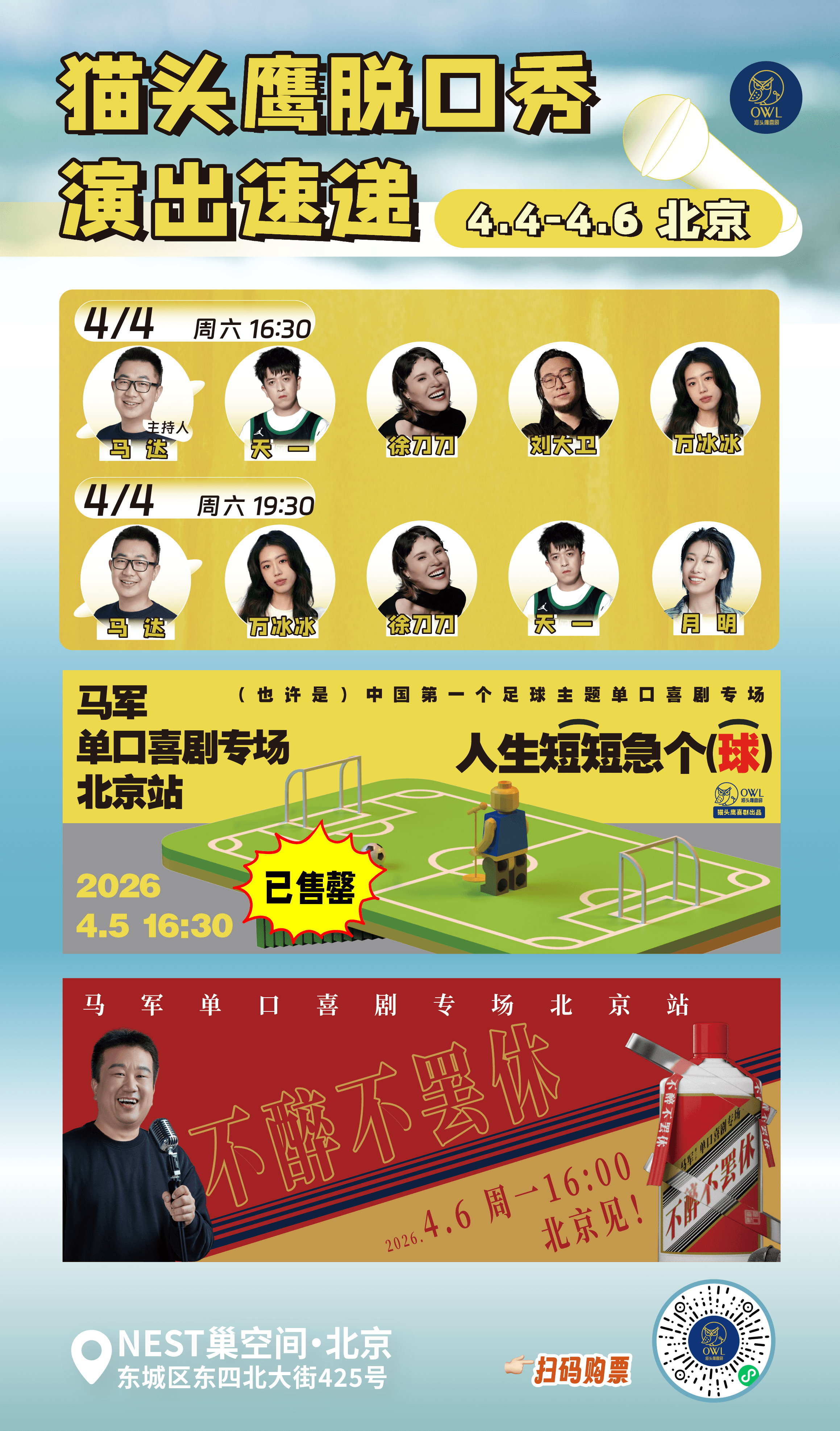 每周在北京还有我们的脱口秀演出,微信搜索小程序「猫头鹰喜剧」,线下脱口秀演出等你来~
