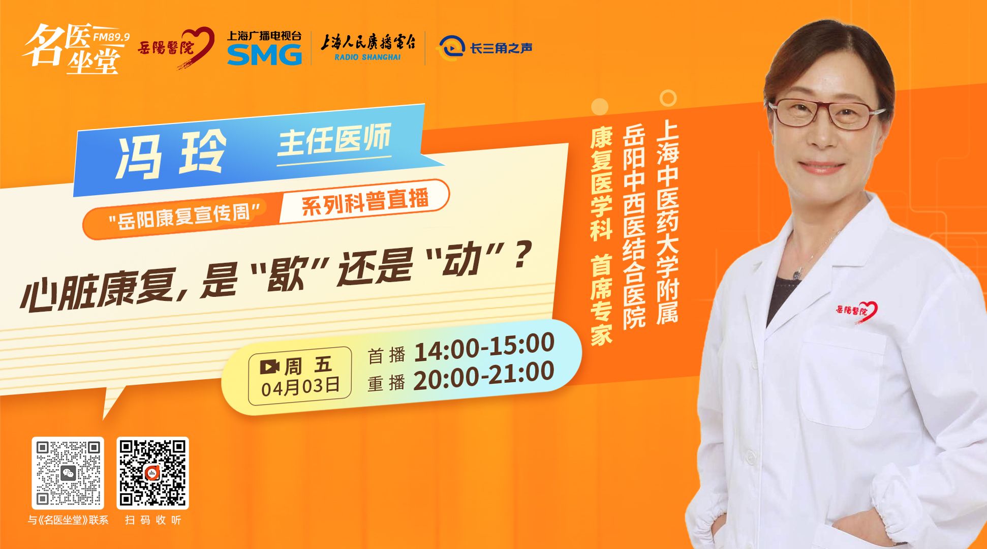本次是健康科普访谈节目,围绕主题“心脏康复到底该歇还是该动”,邀请冯玲教授解答大众对心脏康复的误区,讲解心脏康复的概念、科学方法,现场接听听众提问并给出就医与康复建议。
