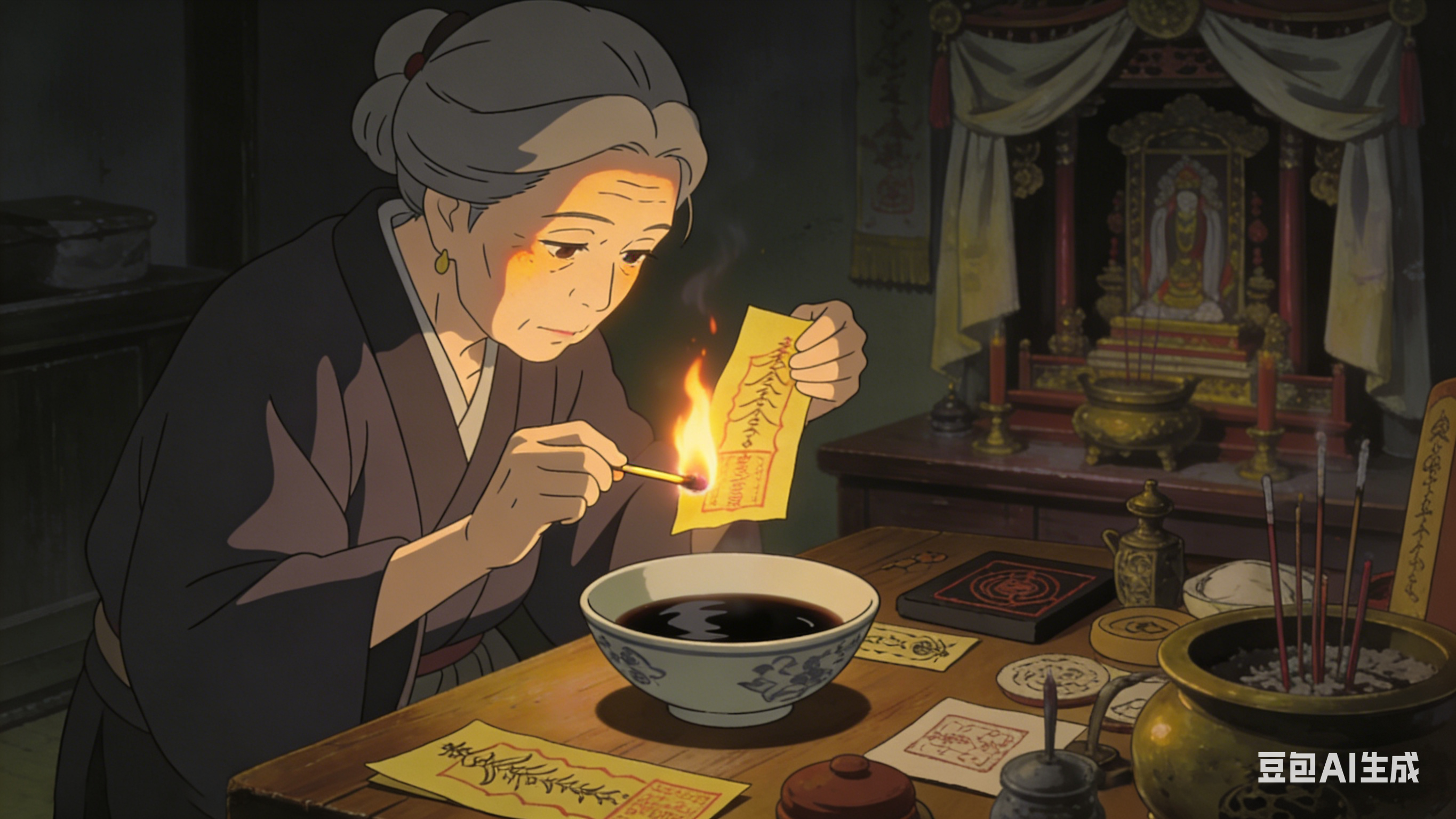 之后,不待这黄纸烧尽,春姑将正在燃烧的黄纸插进烛台旁边的一个装水的碗里。呲的一声火灭了,碗里的水也变成了灰黑色。春姑把碗端到方台之上,用一只很别致的铜勺舀出了一勺灰黑色的水,洒在另一张黄纸之上。只见这水呀在黄纸上竟是自动的爬行,最后形成了一个图案。我清楚地看见春姑的眼神凝重了起来,你外孙是被吓到了。地点是宅地东南方万里路的范围。他走到我外婆跟前,叹了一口气,哎呀,是个40岁左右的女人,枉死的怨气很重。