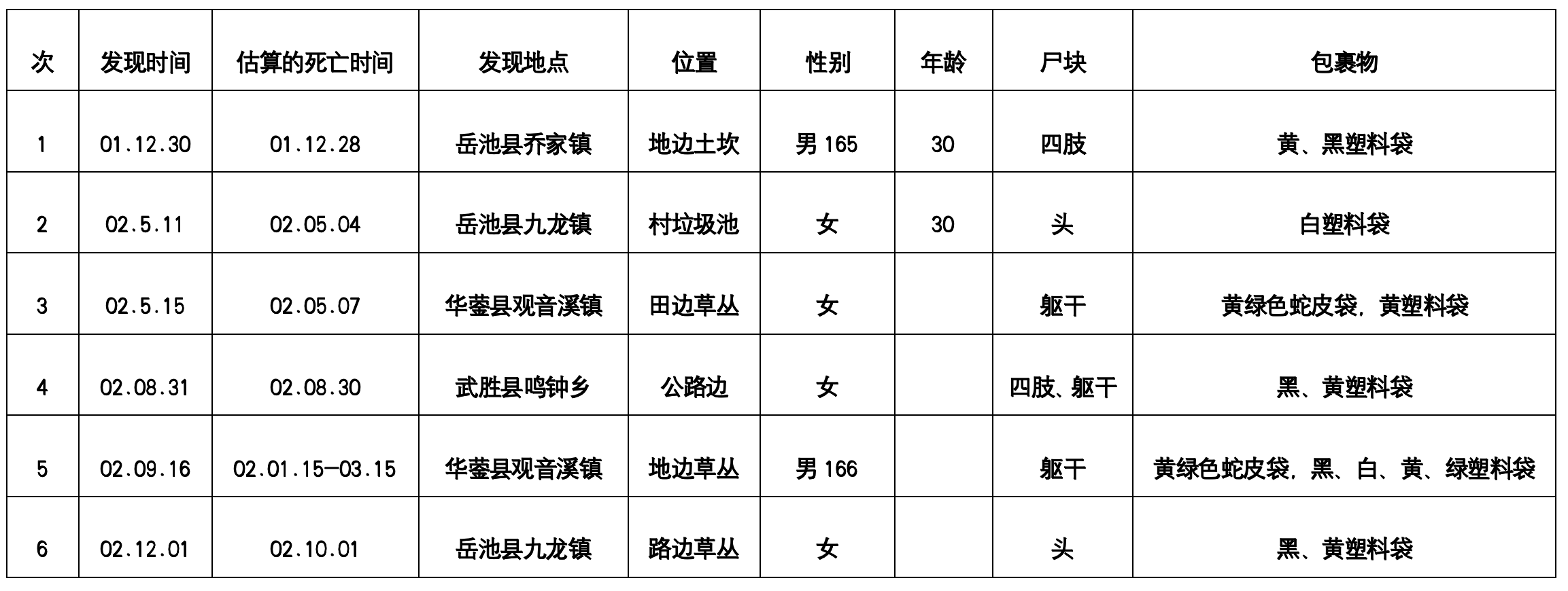 00:00 2001年12月30日下午,有人在岳池县乔家镇某村发现用塑料袋包装的尸块