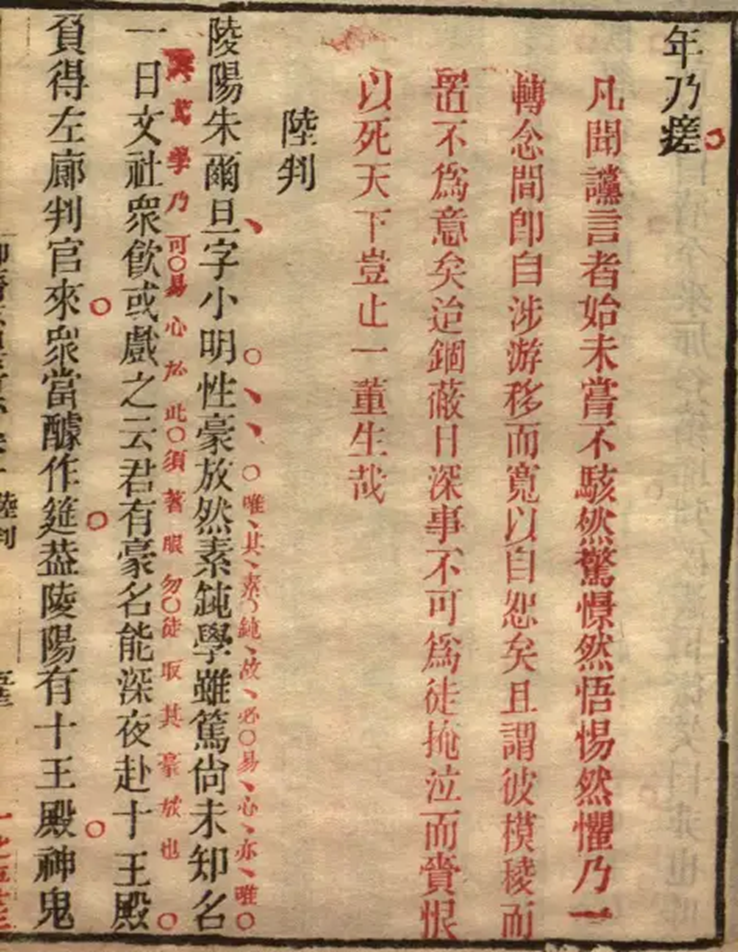 自是三两日辄一来,情益洽,时抵足卧。朱献窗稿,陆辄红勒之,都言不佳。一夜,朱醉,先寝,陆犹自酌。忽醉梦中,觉脏腑微痛,醒而视之,则陆危坐床前,破腔出肠胃,条条整理。愕曰:“夙无仇怨,何以见杀?”陆笑曰:“勿惧,我为君易慧心耳。”从容纳肠已,复合之,末以裹足布束朱腰。作用毕,视榻上亦无血迹,腹间觉少麻木。见陆置肉块几上,问之。曰:“此君心也。作文不快,知君之毛窍塞耳。适在冥间,于千万心中,拣得佳者一枚,为君易之,留此以补阙数。”乃起,掩扉去。天明解视,则创缝已合,有綖而赤者存焉。自是文思大进,过眼不忘。数日,又出文示陆。陆曰:“可矣。但君福薄,不能大显贵,乡、科而已。”问:“何时?”曰:“今岁必魁。”未几,科试冠军,秋闱果中经元。同社生素揶揄之,及见闱墨,相视而惊,细询始知其异。共求朱先容,愿纳交陆。陆诺之。众大设以待之。更初,陆至,赤髯生动,目炯炯如电。众茫乎无色,齿欲相击,渐引去。