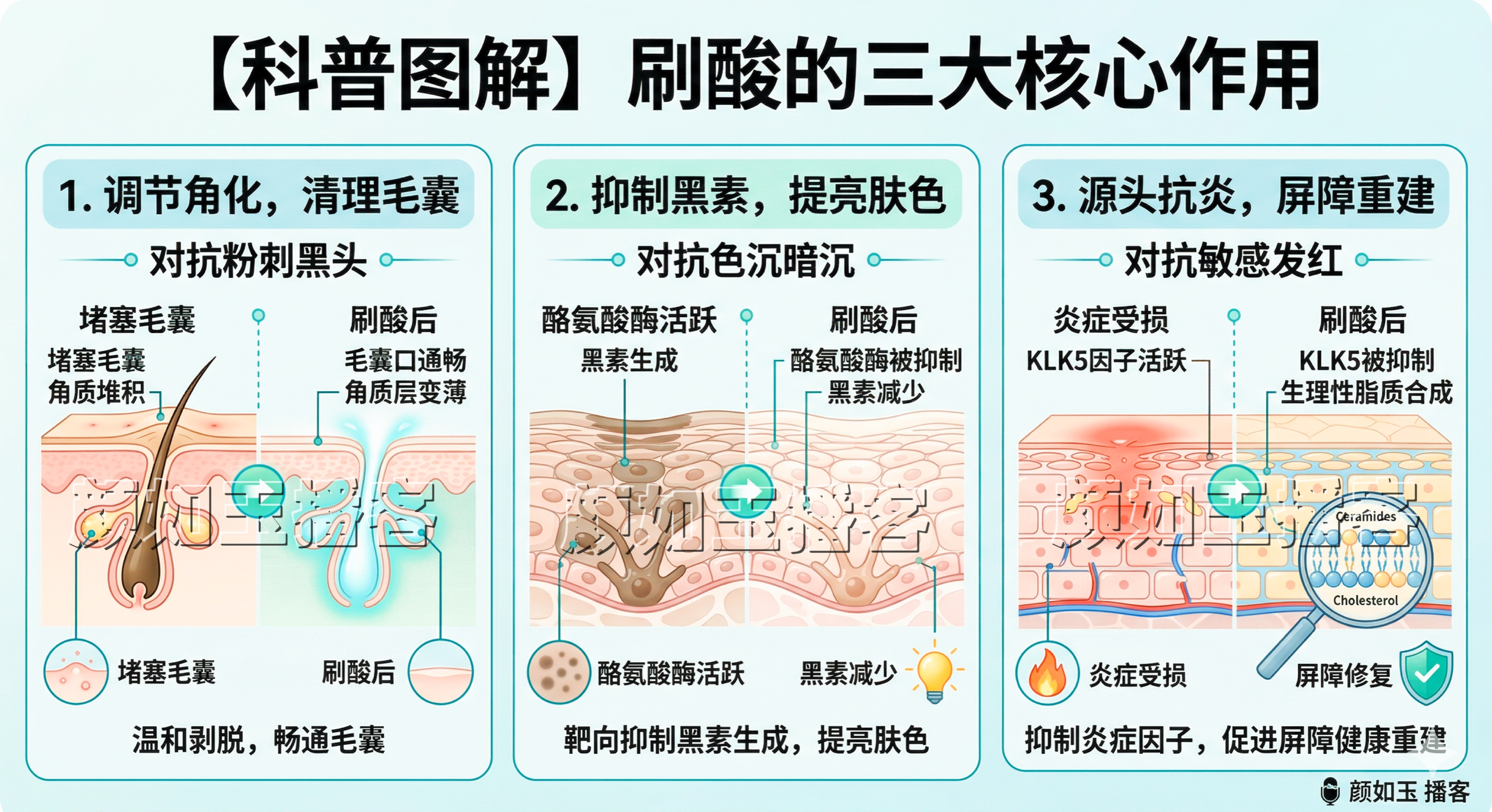 这张科普图片详细阐释了刷酸的三大核心科学机制: