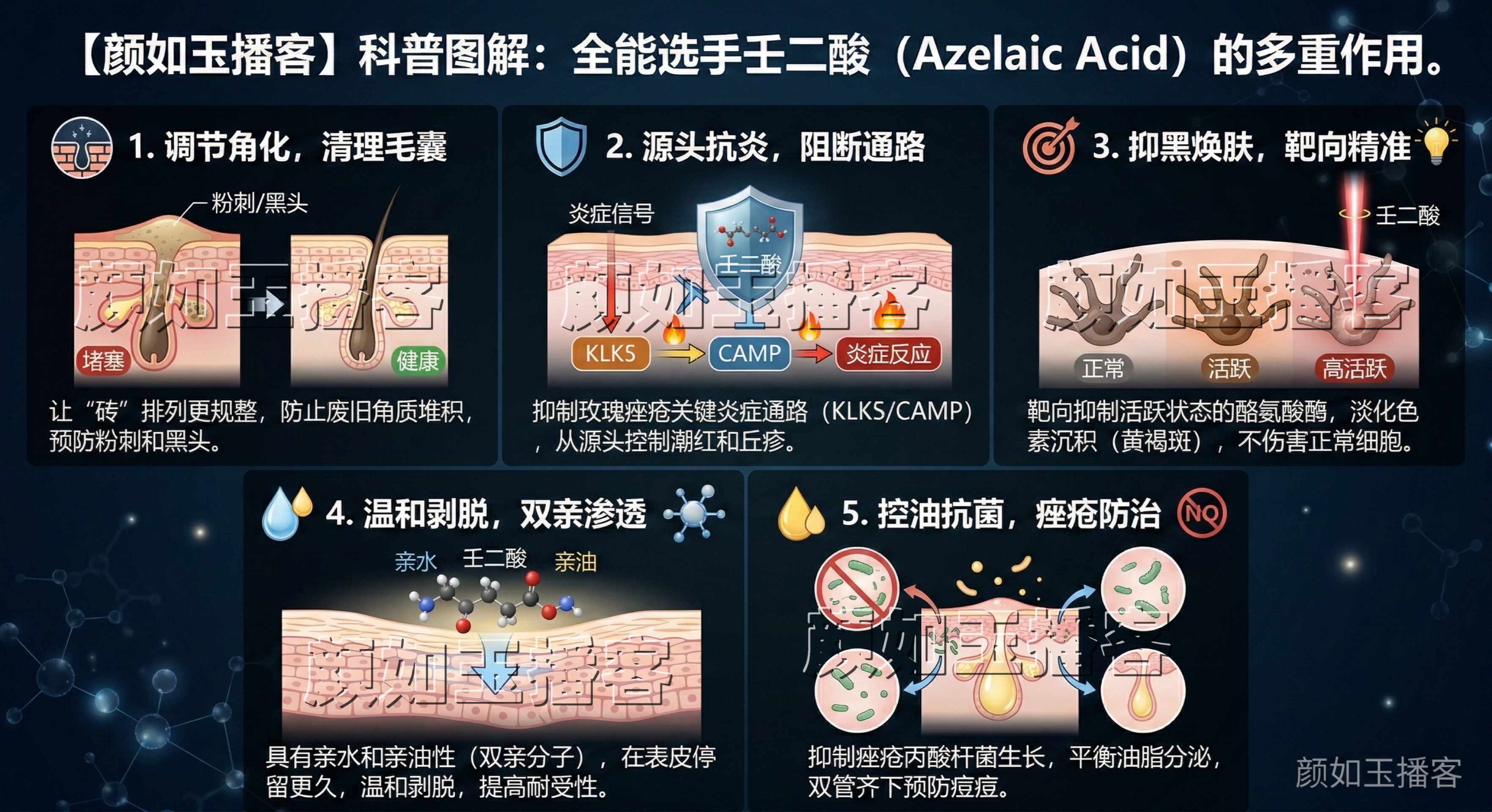 这张图片详尽展示了被誉为“全能选手”的壬二酸在皮肤医学中的五大核心科学机制 :