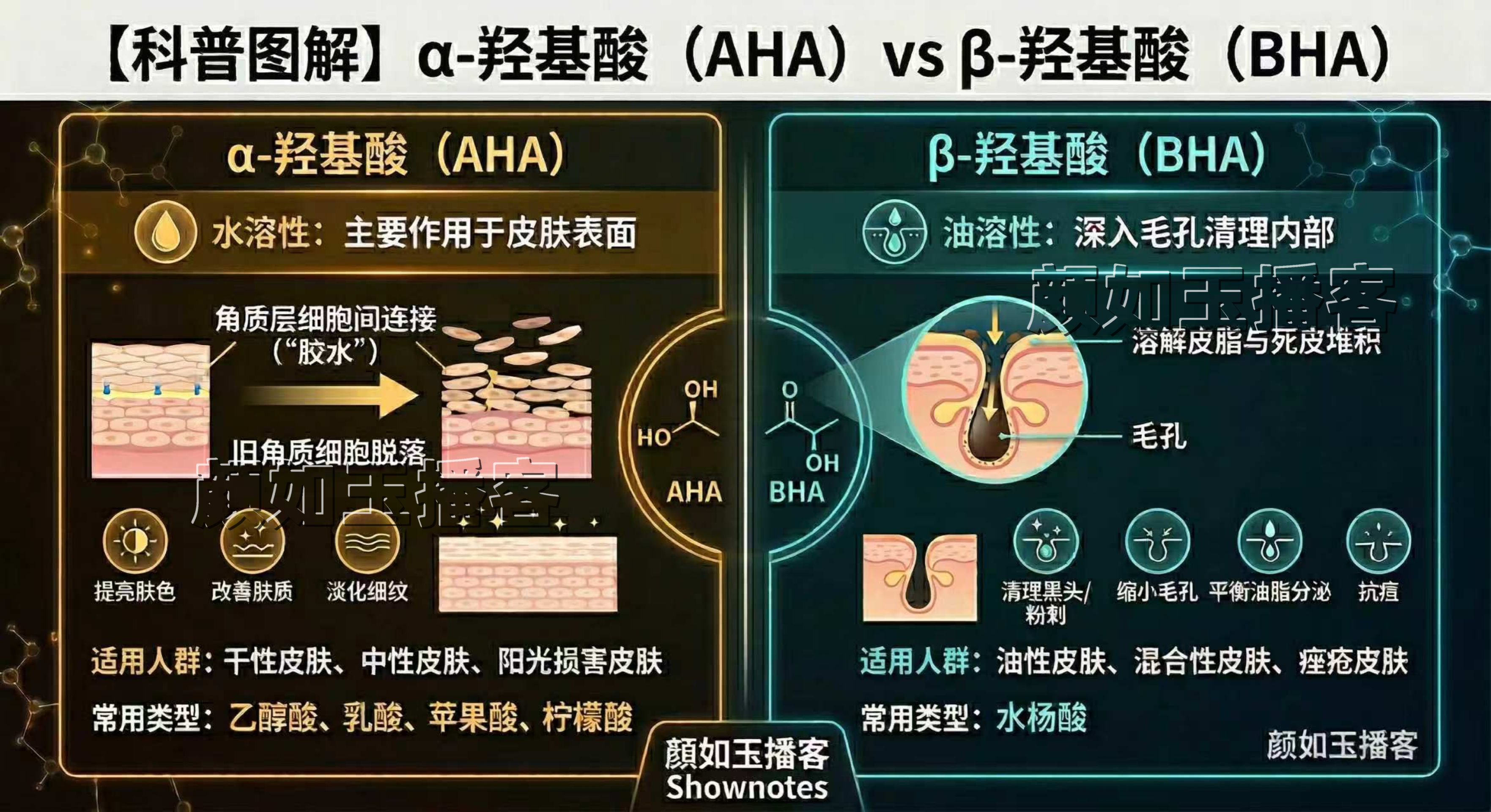 这张图片直观地展示了α-羟基酸(AHA)与 β-羟基酸(BHA)在理化性质、作用机制及适用肤质上的核心差异 :