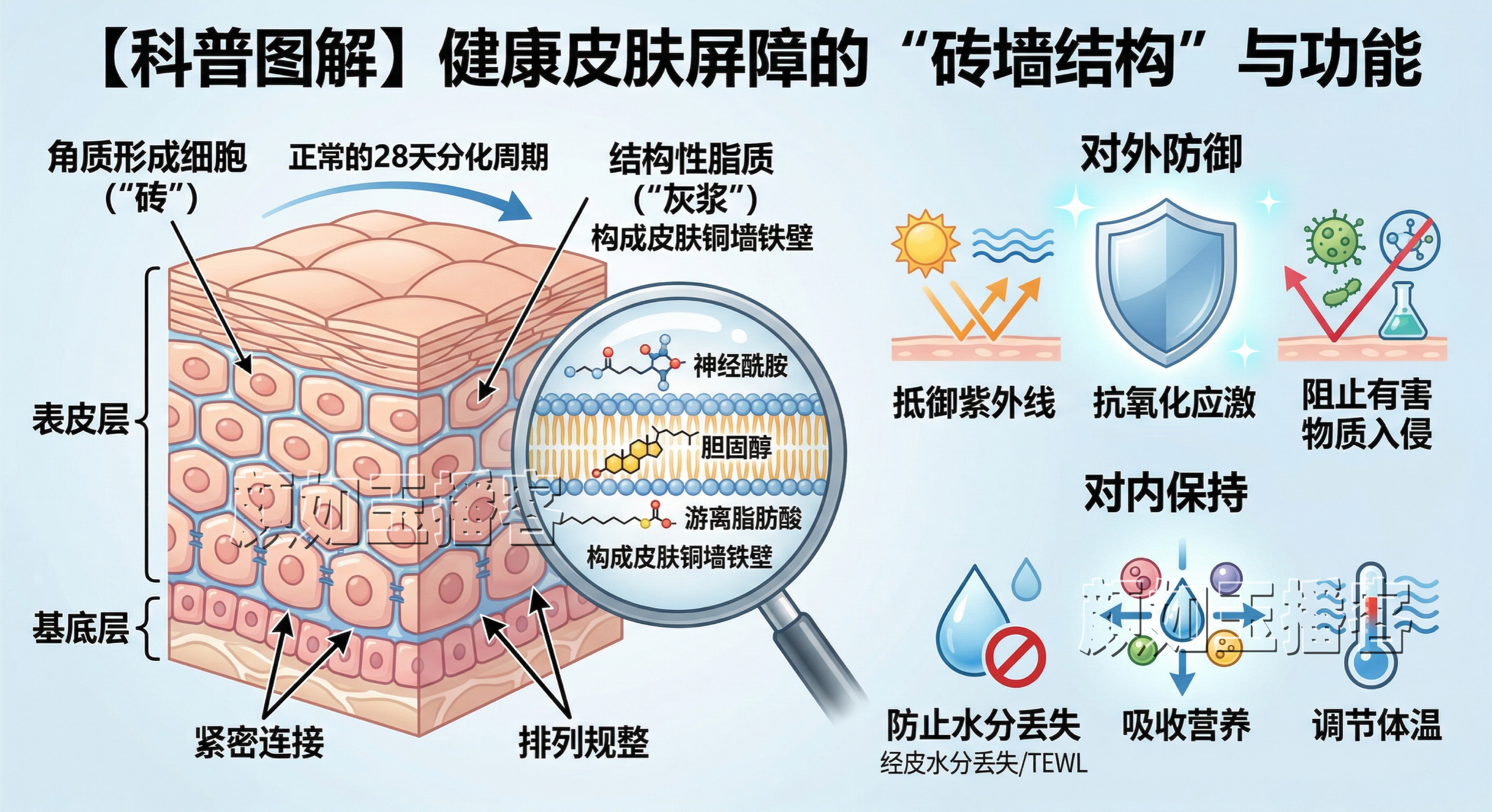 这张图片生动地展示了皮肤屏障的“砖墙结构”及其生理功能 。