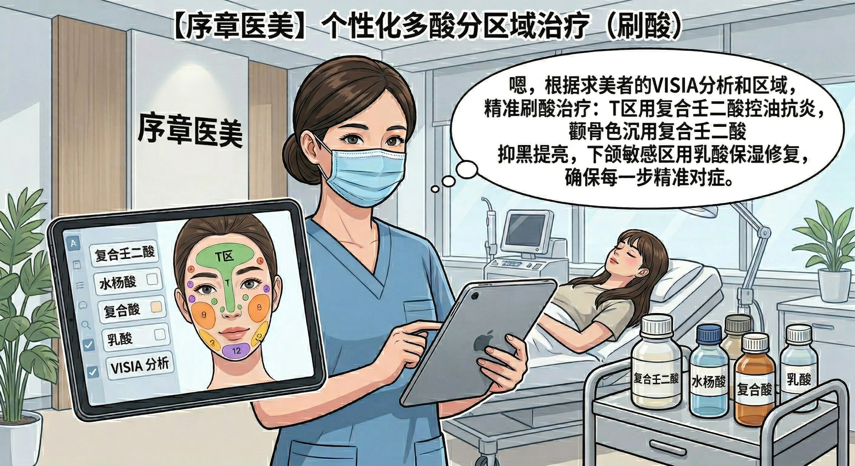 - 个性化“鸡尾酒疗法”:基于 iPad 呈现的皮肤“底色”,护士不再是全脸机械式刷酸,而是实施分区域治疗。例如,在油脂分泌旺盛或有炎症性小疹子的部位使用复合壬二酸(含有山椒素以实现术中无感)来控油抗炎 ;而在需要提亮或保湿的区域,则可能选择乳酸或甘醇酸进行针对性剥脱与补水 。