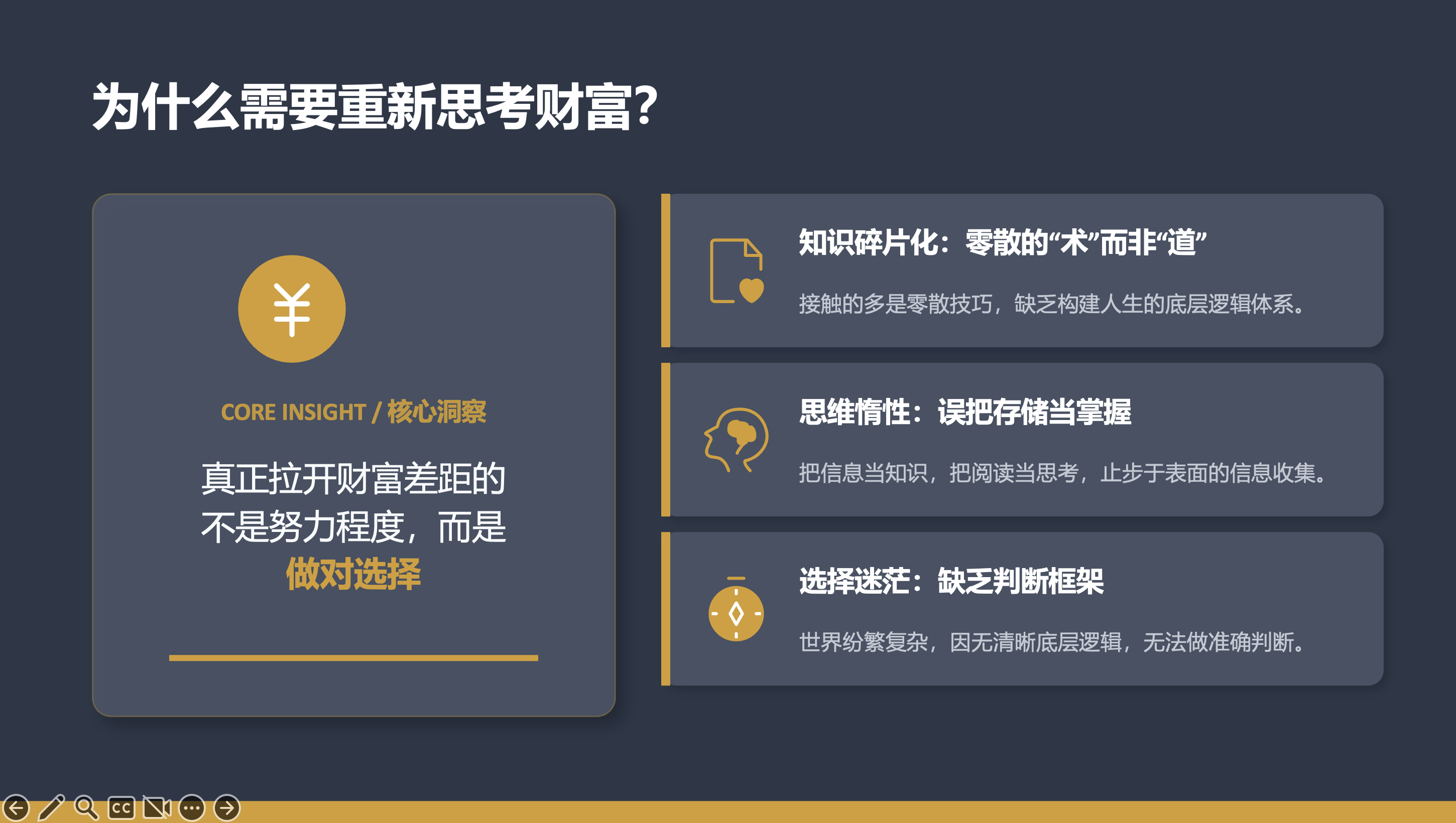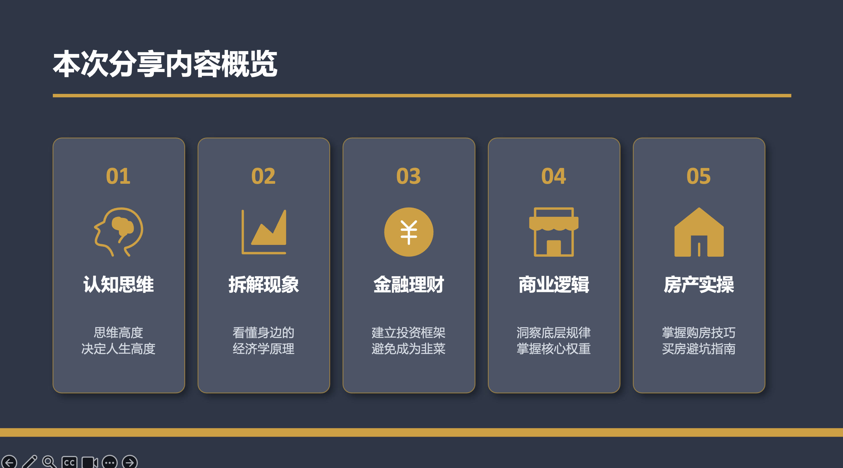本次分享将分为五个部分。首先,我们将探讨“认知思维”,因为思维高度决定了人生高度。接着,我们会“拆解现象”,学习看懂身边的经济学。然后,进入“金融理财”部分,了解如何避免成为被收割的韭菜。之后,我们会揭示“商业逻辑”中被忽略的核心权重。最后,我们会聚焦“房产实操”,提供一些买房避坑的实用指南。