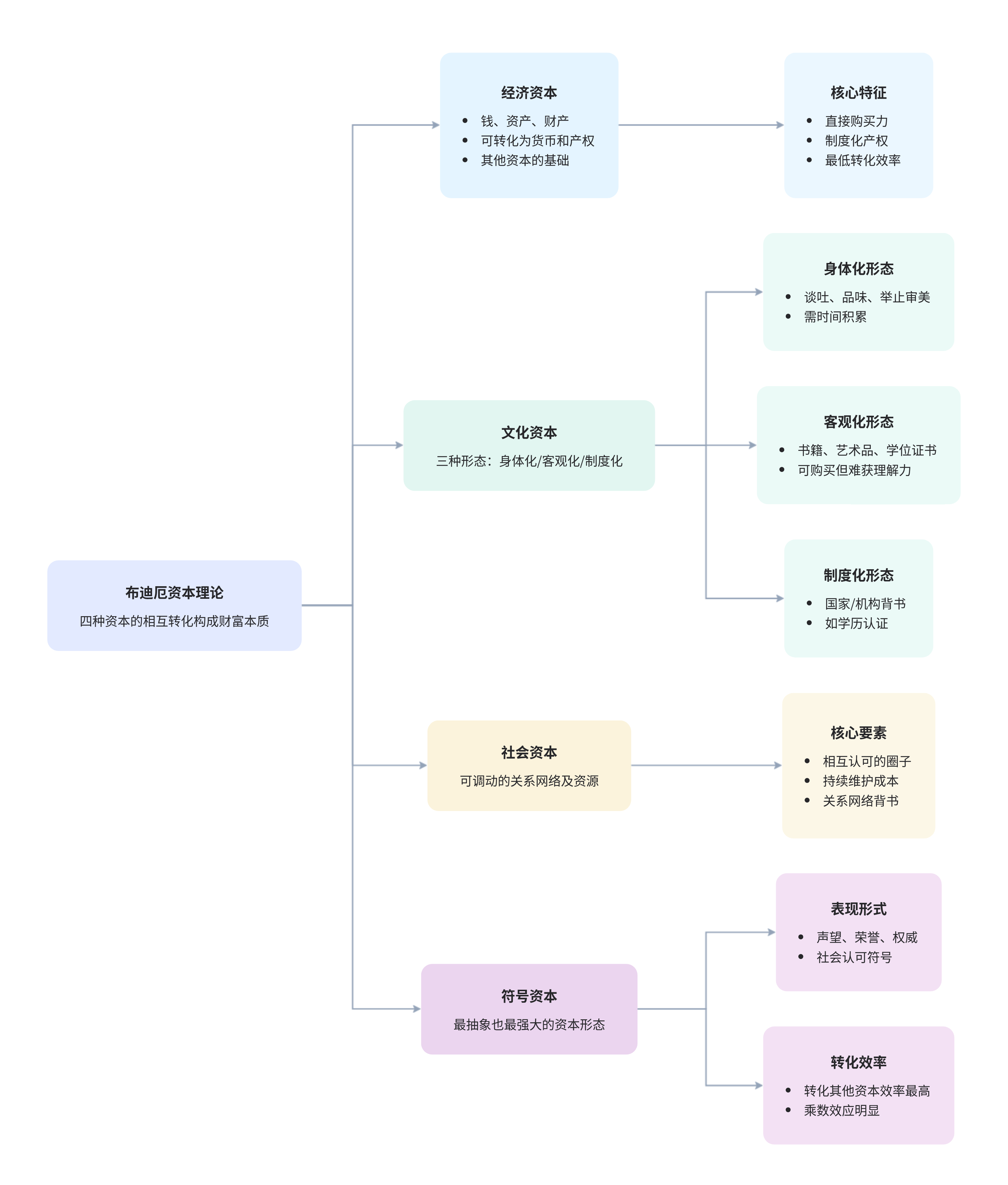 文化资本:分为身体化、客观化和制度化三种形态。身体化形态需要时间的积累,如谈吐、品味;客观化形态可以购买,如书籍、艺术品;制度化形态则由国家或机构背书,如学位证书。