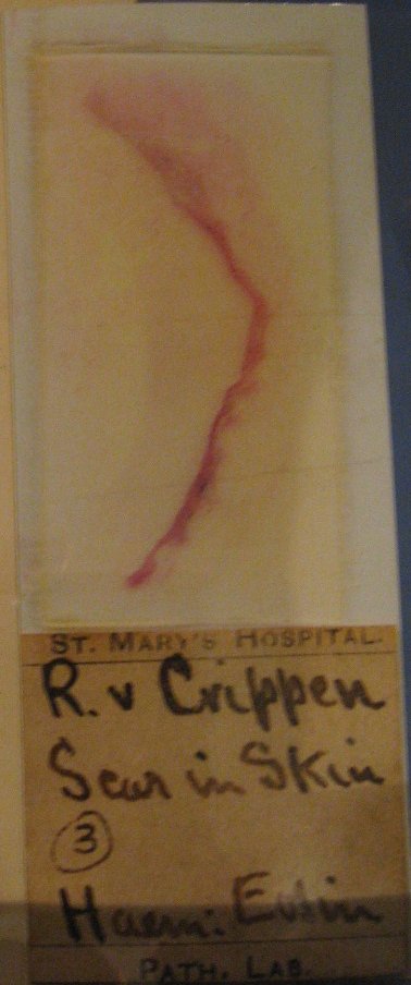 在地窖发现的皮肤上马蹄形痕迹切片的载玻片