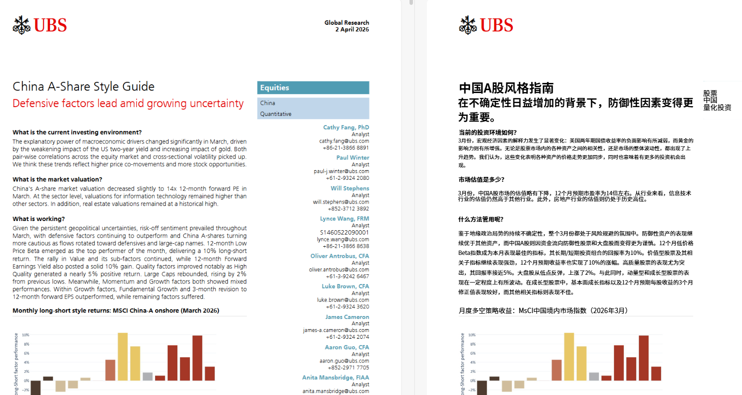 瑞银(UBS)全球研究部于2026年4月2日发布的《中国A股风格指南》报告,核心观点是:在不确定性加剧的市场环境中,防御性因子表现领先。