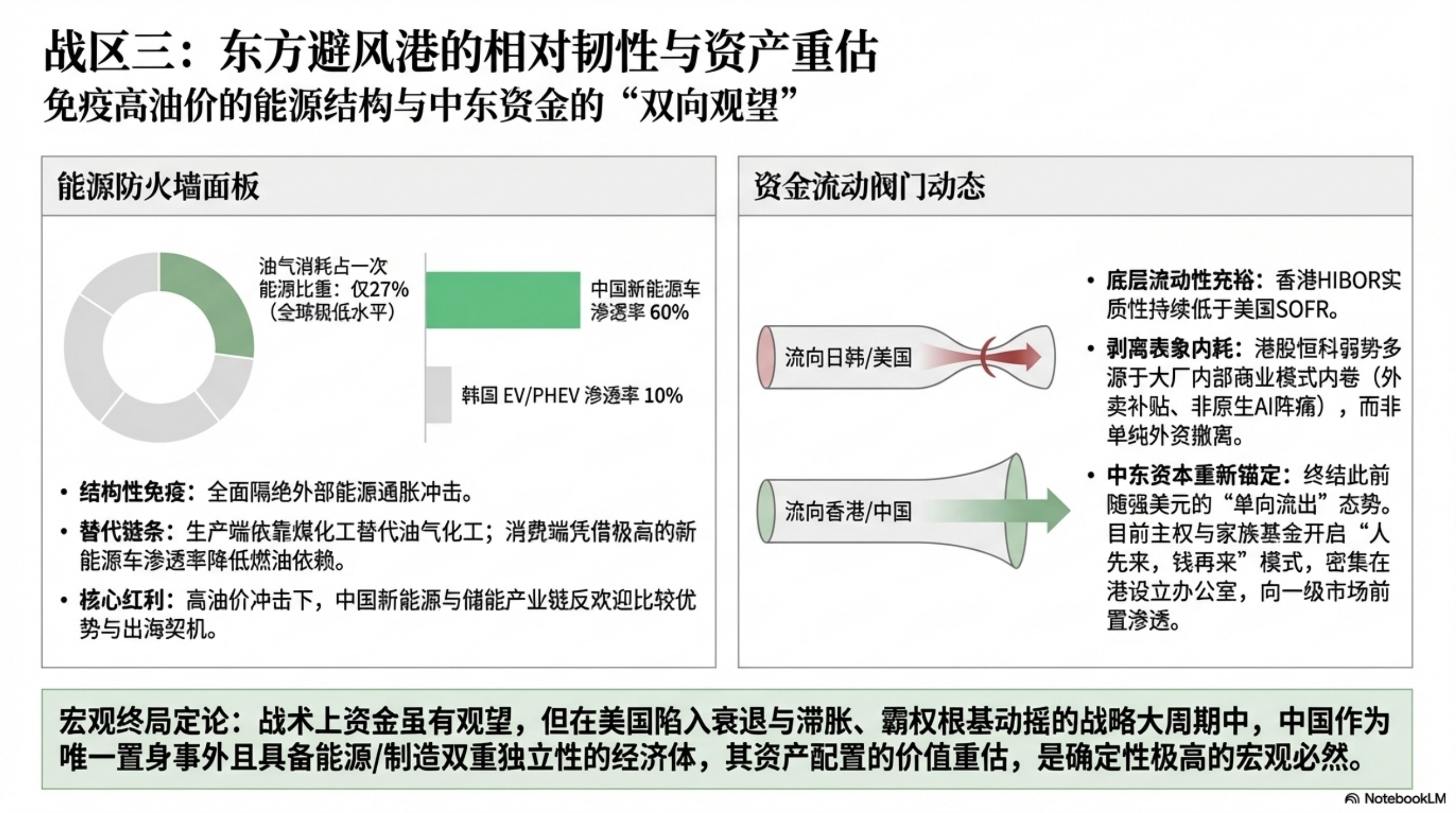美股出现补跌,初期避险为主,但基本面相关的股票也开始回调。这反映出市场不仅担忧流动性和不降息,还对高油价对需求的冲击感到担忧。对中国来说,资金是否流入香港仍需观察,港股市场表现本身稳定性较弱。而恒科指数跌幅较大,主要受互联网公司不当行为及补贴大战影响,并面临来自字节跳动等AI原生企业的竞争压力。尽管如此,香港资金宽松程度显示可能有净流入,且中东资本可能搬迁至香港。从长远看,中国在能源成本、供应和替代方面具有优势,预计将从战争中受益。