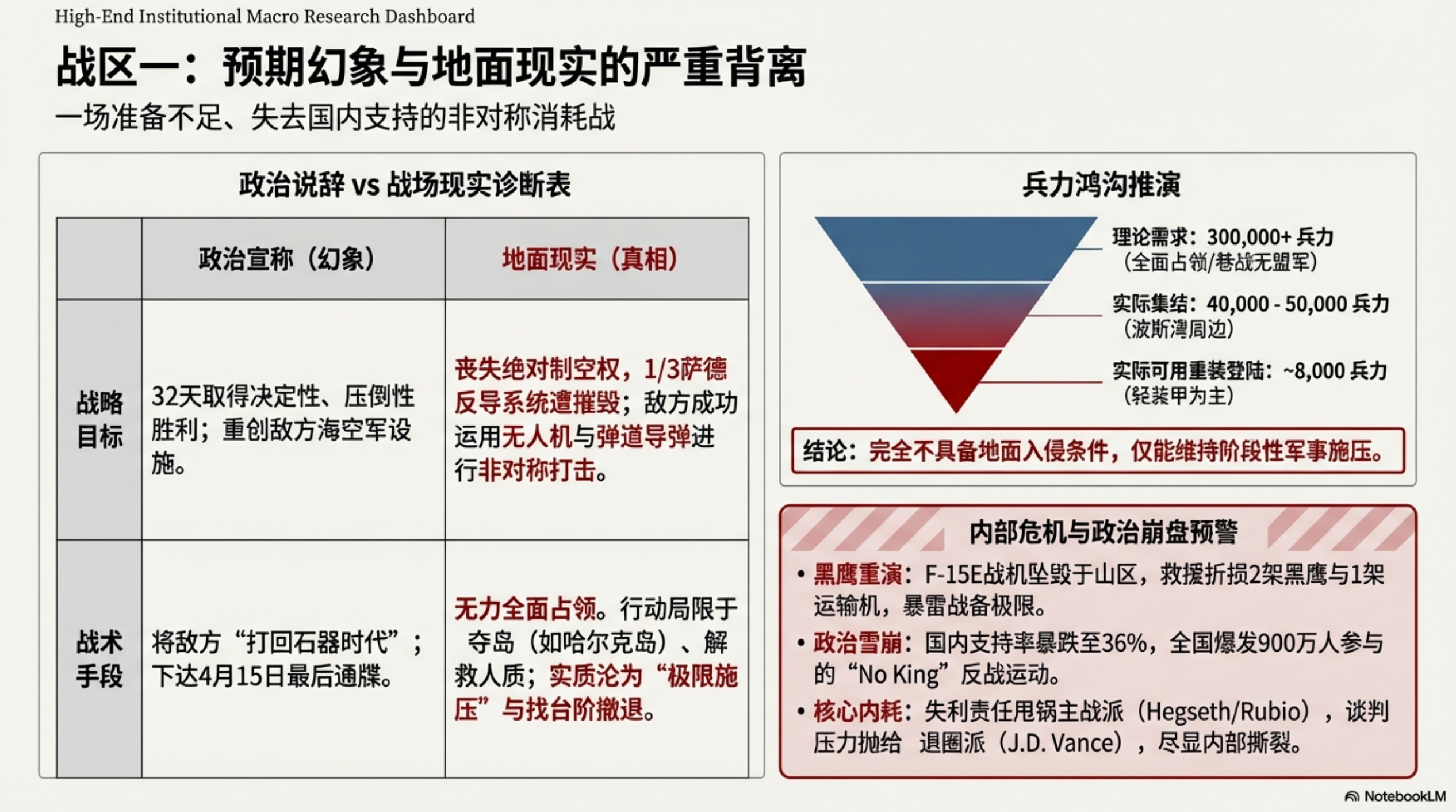 美伊朗冲突影响国内支持率,并反过来作用于战争的走向。美军f15e战机被击落可类比93年索马里黑鹰坠落事件,证明飞行员被俘的危险性和对美军战略的影响。特朗普因此事承受巨大压力,但好在最后美军成功救出飞行员。