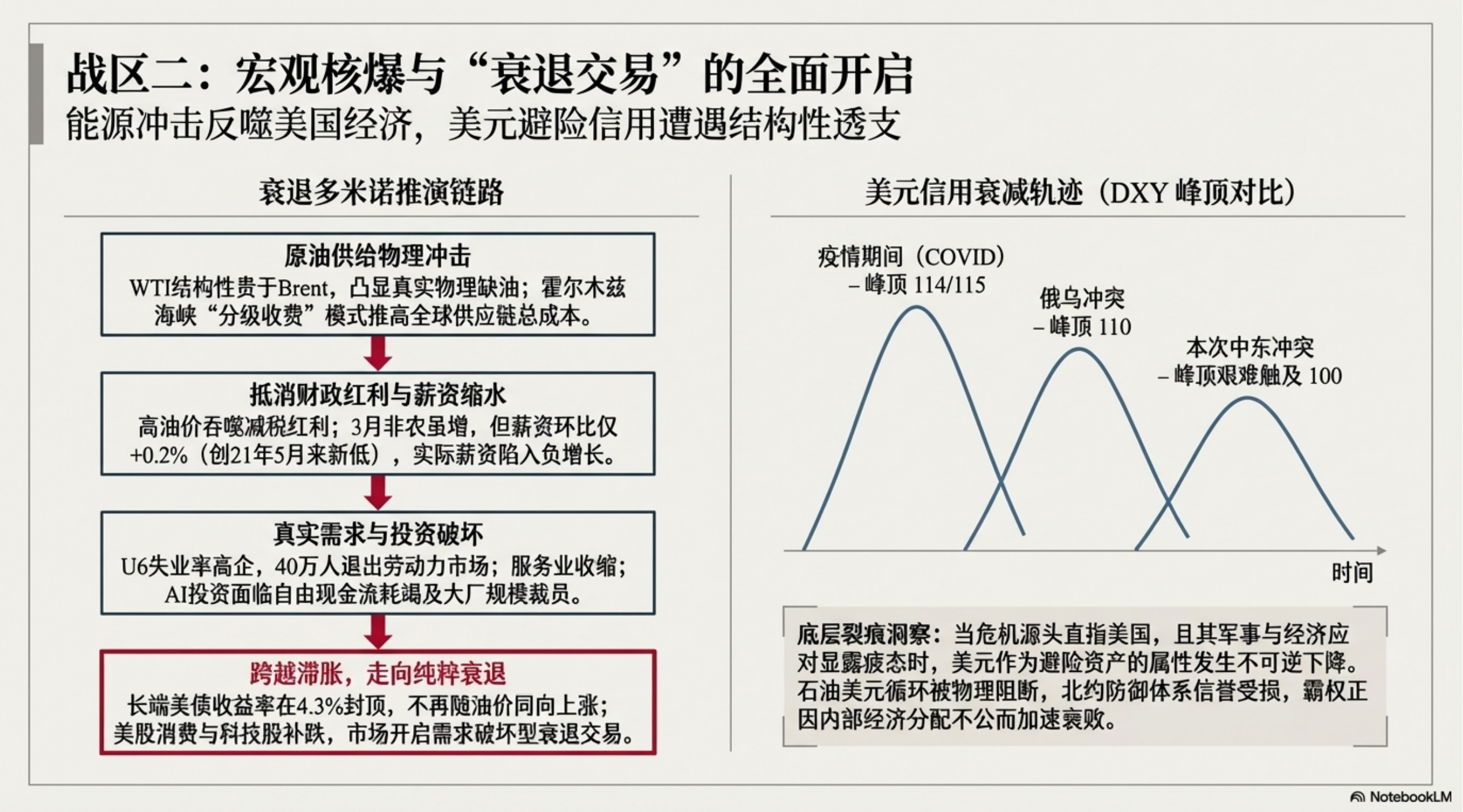 白宫提交的2027财年预算显示,国防预算相比于2026年增加了4500亿美元,达到1.5万亿美元,这是二战以来占GDP最高的水平。在伊朗战争中,美国损失了大量飞机、导弹和军事设施,如f35战机、A10和萨德系统,且美国的战争策略被认为是不对称的消耗战。美国老百姓对伊朗战争的关心度不高,主要关心的是油价问题。特朗普面临的政治压力巨大,包括经济议题和对外形象的损失。此外,美元霸权和石油美元循环受到挑战,北约防御体系也受到影响。但美国的衰败源于内部经济问题,而非战争。