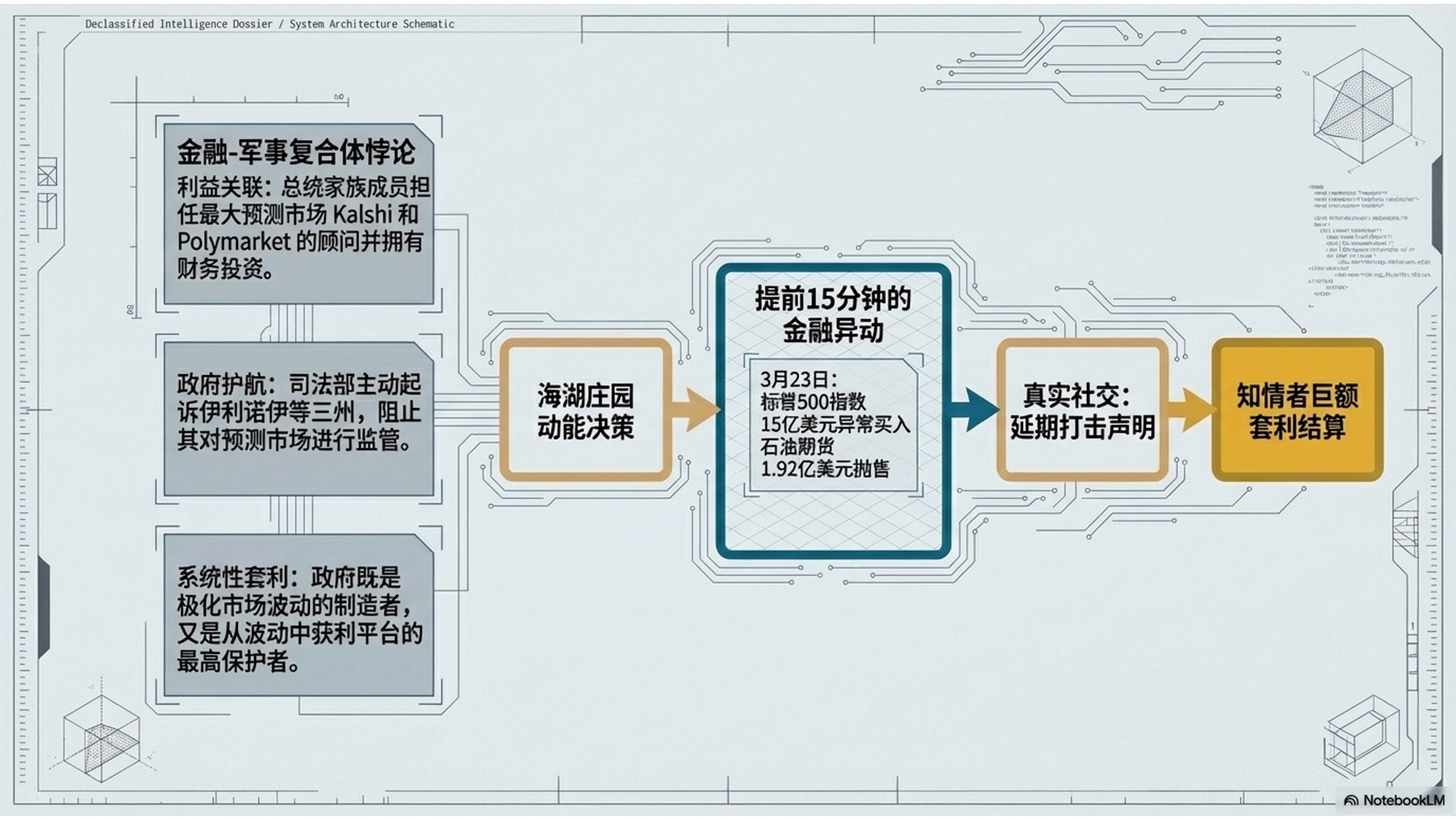 节目指出,特朗普在这40天的冲突中打破了传统军事决策体系,他绕过五角大楼,在海湖庄园的极小圈子内,受以色列游说直接指挥了针对伊朗高层的“斩首”行动。更为荒诞的是,他将社交媒体(Truth Social)变成了实时的军事指挥和心理战平台。这种反复无常的军事威吓不仅引发了全球石油等市场的剧烈震荡,还催生了史无前例的“金融军事复合体”——使得掌握内幕消息的核心圈子(包括其家族深度涉足的预测市场)能够把战争包装成金融资产借机攫取暴利。
