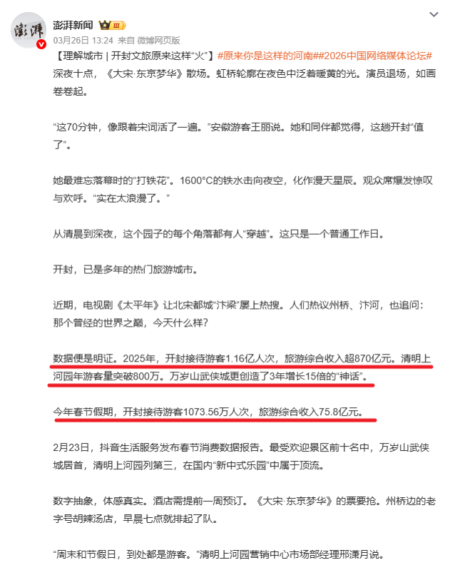 这两年,河南文旅越来越像一个值得被认真研究的样本。它吸引人的,不只是几个出圈景区,也不只是社交媒体上的热度,而是一种把历史、人物、场景和参与感重新组织起来的能力。从开封府到清明上河园,从武侠氛围到NPC互动,再到数字技术和现场演绎的配合,河南真正厉害的地方,也许不是简单地“复原古代”,而是让游客在今天重新进入那个世界,并且愿意相信那个世界片刻是真的。