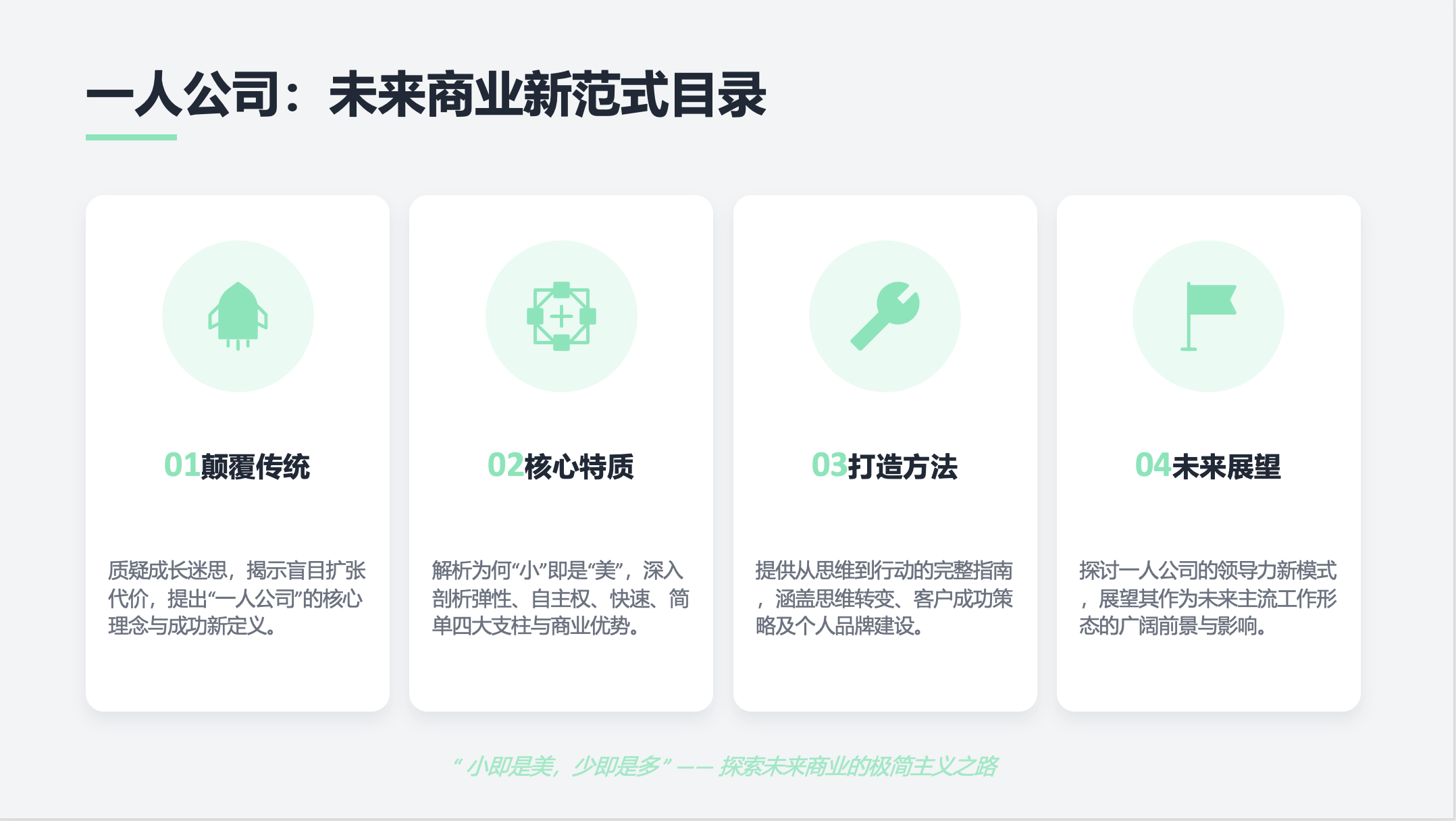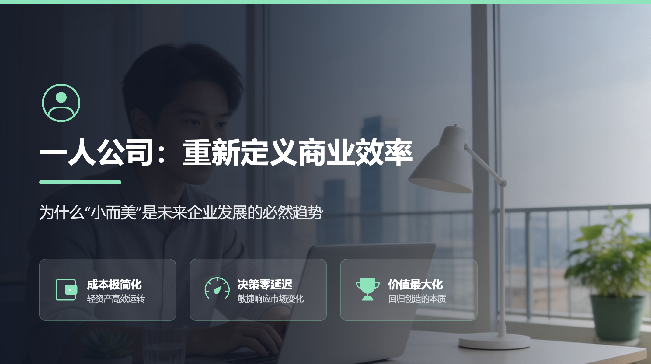 大家好,欢迎参加今天的分享。在这个追求规模化、高增长的时代,我们不禁要问:成功的企业一定是越大越好吗?今天,我将和大家一起探讨一个颠覆性的概念——“一人公司”,并深入分析为什么“小而美”可能才是未来企业发展的真正趋势。让我们一起重新定义成功,探索一种更健康、更可持续的商业模式。