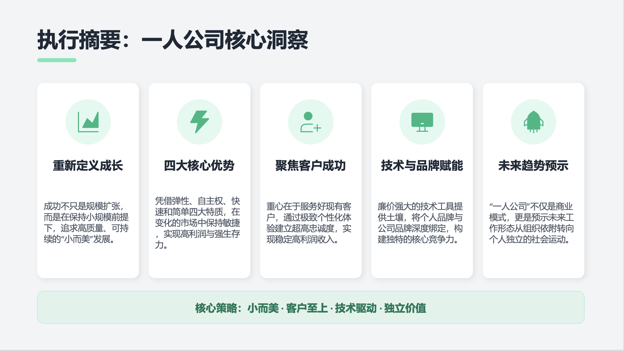 在开始详细探讨之前,让我们先来看一下本次报告的几个核心洞察。首先,我们需要重新定义“成长”,从追求“更大”转向追求“更好”。其次,一人公司具备弹性、自主权、快速和简单这四大核心优势。第三,成功的关键在于聚焦客户成功,而非盲目获取新客户。第四,技术和个人品牌是一人公司崛起的两大基石。最后,这种模式预示着一场深刻的社会变革,代表了未来工作的新方向。
