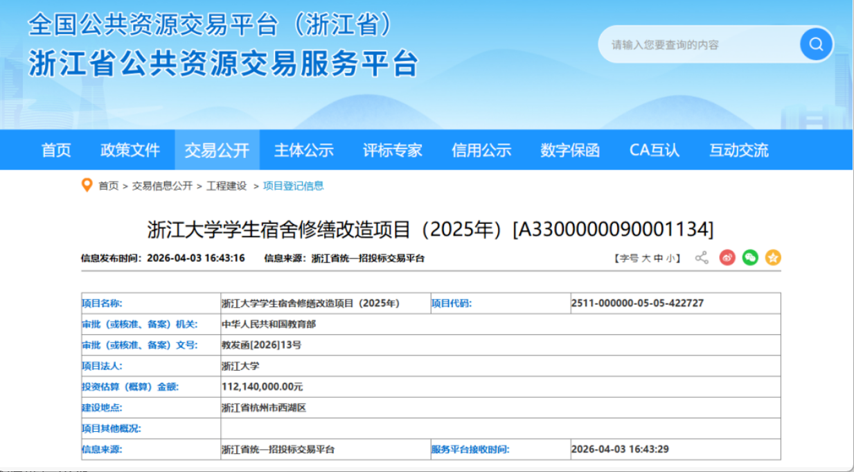 浙江大学投入1.12亿元,对两校区8幢学生宿舍进行修缮改造,项目已获教育部审批,总建筑面积超4.4万平方米。学校去年已完成部分宿舍改造惠及近3000名学生,此次改造将进一步改善住宿体验,为高校后勤保障提供示范。