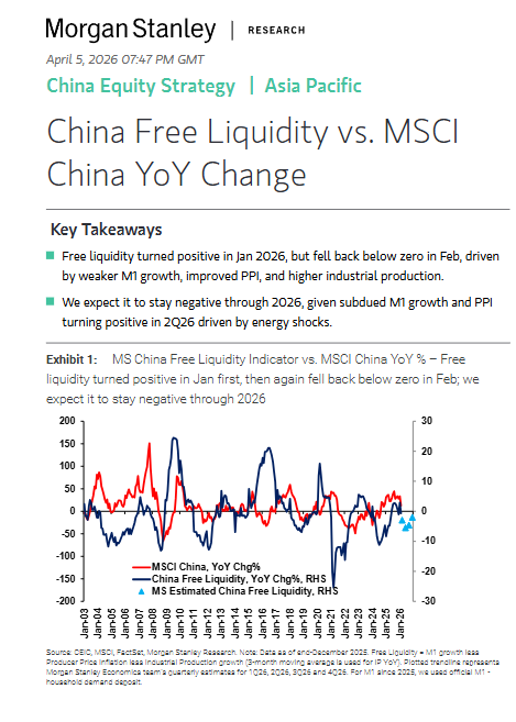 摩根士丹利于 2026 年 4 月 5 日发布中国股票策略更新,核心围绕中国自由流动性指标与MSCI 中国指数的关联展开分析,释放关键市场信号。