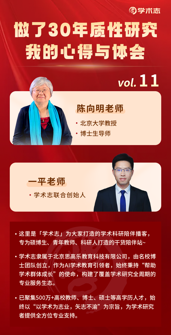 这里是#学术志官方播客#第十一期,本期邀请陈向明老师,分享30年质性研究一线心得与体会从研究初心、方法选择、田野实践到论文写作、学术成长,老师用最真诚、最扎实的经验,给所有做质性研究的同学一份长期指南。