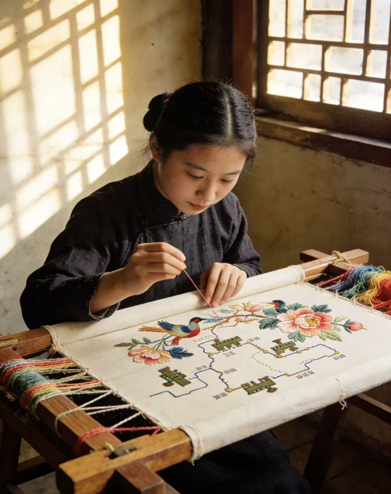 注:这是林秀娥在绣坊中借着刺绣暗藏情报,温柔的日常之下是惊心动魄的坚守的场景。(本图片为AI生成)