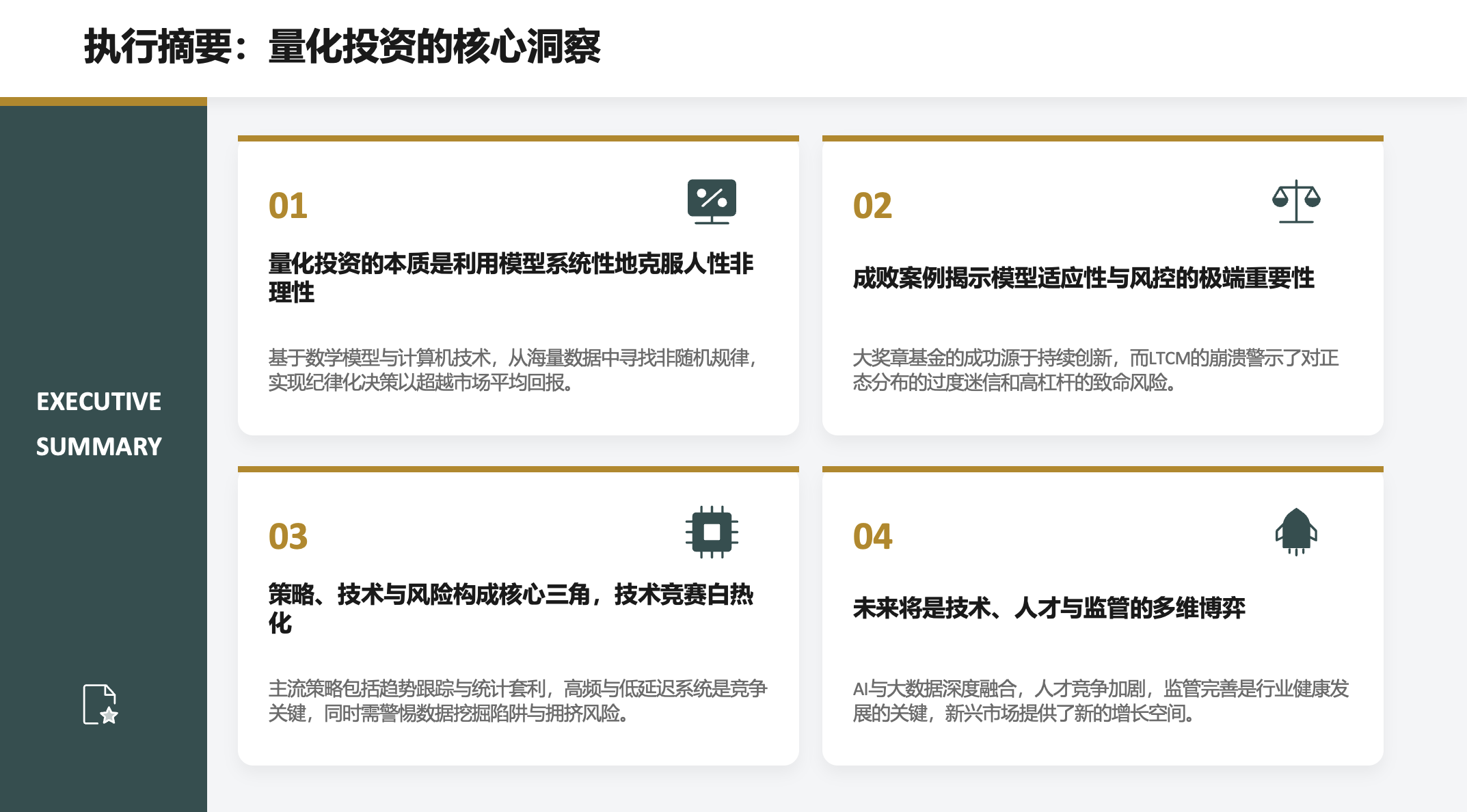 在开始深入探讨之前,我们先来看一下这份报告的四个核心结论。首先,量化投资的本质是利用机器来克服人性的弱点,实现系统化的投资。其次,通过对比大奖章基金的成功和LTCM的失败,我们看到了模型适应性和风险控制的极端重要性。第三,策略、技术和风险是量化投资的核心三角,技术竞赛已经进入白热化阶段。最后,展望未来,量化投资将是技术、人才和监管的多维博弈。这四个要点将贯穿我们今天的整个讨论。