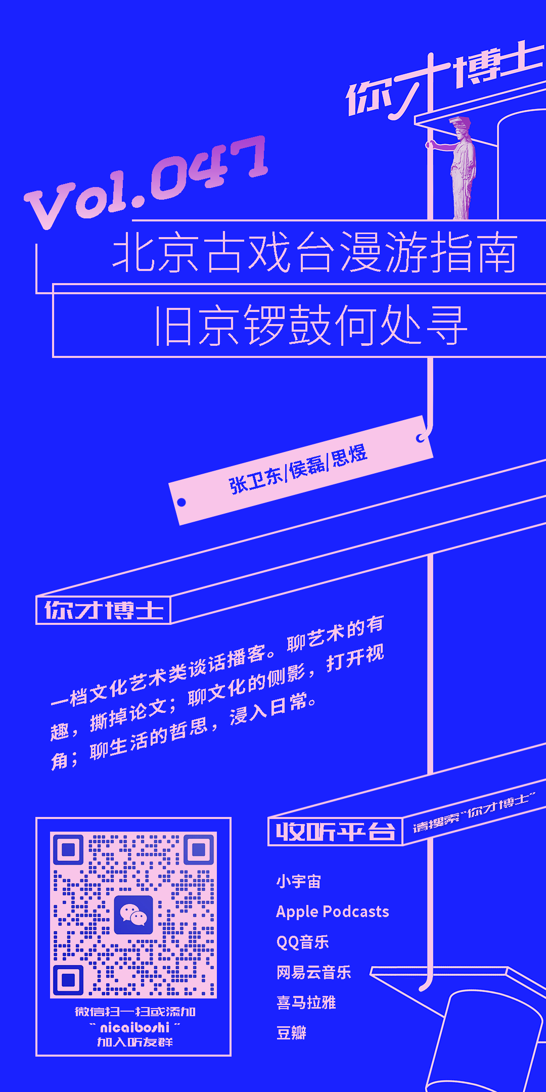 本期我们和两位老朋友张卫东先生、侯磊老师一起聊聊北京地区的古戏台。北京的古戏台历史可以追溯到什么时候?宫廷戏台、府邸戏台、庙宇戏台、会馆戏台、茶园戏台分别都有哪些遗存?在这些戏台上曾经都是如何演戏的?有什么有趣的故事?古戏台上有哪些有趣的戏曲楹联?今天我们还能看到哪些古戏台?欢迎大家收听~